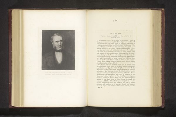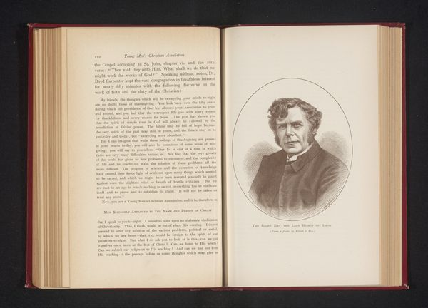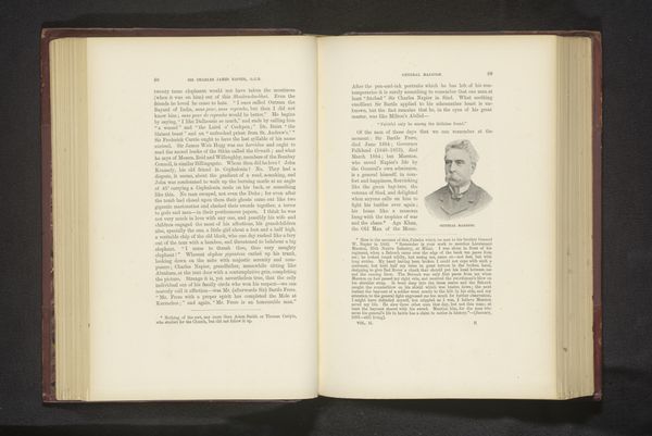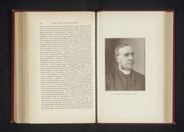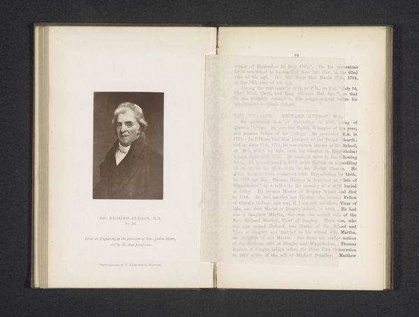 Editor: Here we see a gelatin-silver print, dated between 1893 and 1895, titled "Vignette Portrait." The book and photograph, especially with the aged paper, gives me a solemn and almost antiquated feeling. What stands out to you about the composition? Curator: The stark juxtaposition of the portrait and the text presents a compelling formal problem. Consider the contrasting textures: the smooth photographic surface against the aged, fibrous paper. The typface also adds to the construction of the piece. How does the visual rhetoric of these elements—line, form, texture—create meaning? Editor: The differing fonts make it feel disconnected. Is that intentional, or a reflection of printing capabilities at the time? Curator: That is precisely the formal question we must interrogate! Are the choices aesthetic, technological, or both? Focus on how the framing of the subject—the vignette itself— isolates him. How does that inform our reading of the facing page and the content there? The arrangement and balance of the whole image directs how the eye moves. Editor: I hadn’t considered how the vignette emphasizes the individual on the right page versus the long printed form on the left page, almost calling us to decide which is of higher significance. Curator: Exactly. It also provokes thoughts about surface versus depth, image versus text. These opposing forces and their placement are worthy of contemplation, do you agree? Editor: Yes, it is quite revealing! Thanks, that gives me much to ponder. Curator: It’s in these relationships and contradictions that artworks often yield the richest insights.