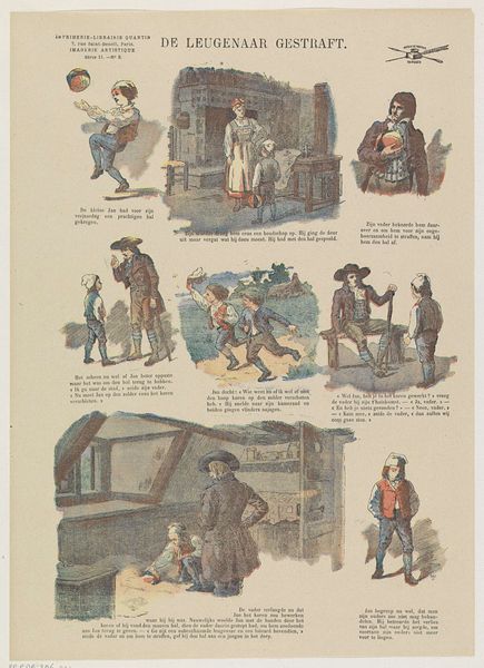 Curator: This print, "Beloonde Liefdadigheid" by Albert Quantin, likely made between 1876 and 1893, presents a sequence of scenes reminiscent of a morality tale. It’s fascinating how the artist arranges these distinct vignettes within a single frame, almost like a storyboard. Editor: Yes, it's a little busy, but the layout kind of draws me in, almost like following panels in a comic. There is a mix of outdoor and indoor scenes. What elements do you find most visually interesting about its design? Curator: Immediately, my attention is drawn to the repetitive use of line and color that visually stitches together the disparate narratives. Consider the recurring figure of the boy. His placement in each panel and similarly muted tones— primarily ochre and russet with highlights of red —creates a rhythmic movement across the surface of the print. Editor: So, it's not about understanding each little scene on its own but more the relationship between them, how they work together? Curator: Precisely. Observe the delicate balance achieved by the artist through compositional mirroring. In one panel, the boy kneels, planting flowers; directly opposite, he presents them. Such structuring imbues the artwork with an innate harmony. Notice, too, the considered use of shadow to give weight and dimension to the characters within these highly flattened and stylized renderings. Do you see that as well? Editor: Now that you mention it, the mirroring does make it easier to understand. I also notice a real emphasis on detail through line work and some flat color. It really draws attention to certain moments, and this seems key to your emphasis on structure. Curator: Absolutely, and the arrangement and coloring support this visual cohesion; each compositional choice invites careful, repeated consideration of its integral role in establishing the meaning. It highlights the importance of close reading and appreciation for design to understand works like these. Editor: I hadn't considered the power of the layout so directly. Now I see how much visual storytelling can happen on a formal level through shape, line and the figures.