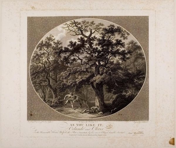 Editor: This is William Ellis's "Scene from Vicar of Wakefield." It has this charming, almost idyllic quality. What symbols or cultural memories are evoked for you? Curator: The circle itself, a visual symbol of wholeness and continuity, frames a scene from Oliver Goldsmith's novel. Do you see how the figures are arranged almost as if on a stage? It suggests a tableau, a frozen moment rich with implied narrative. Editor: I see it now! Like a memory being re-enacted. Curator: Precisely! The tree, with its protective canopy, is a symbol of family and shelter. The distant landscape hints at aspiration, but also the unknown. Editor: The piece feels like a family story, a cultural snapshot. I hadn't considered the circular frame as symbolic. Curator: Seeing the visual language helps to unlock layers of meaning!