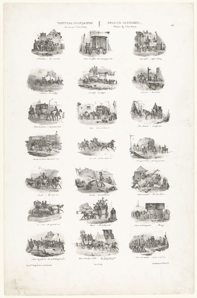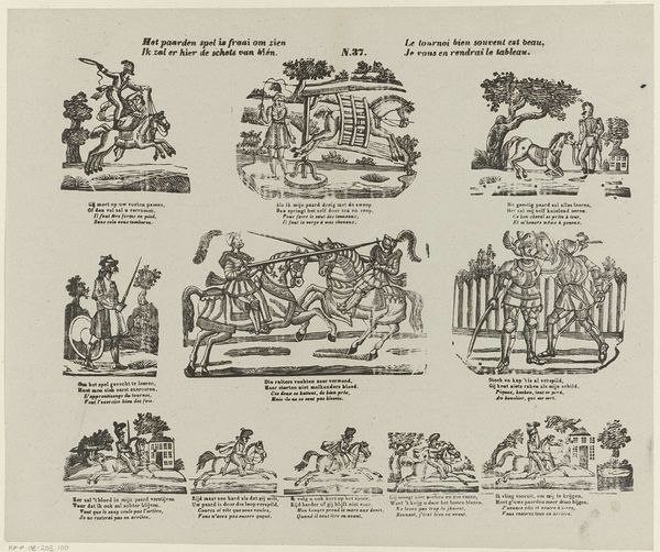 Curator: This engraving, titled "Als gij o lieve jeugd! uw lessen hebt geleerd…," by Glenisson & Zonen, likely dates between 1856 and 1900, presenting a series of narrative vignettes. It gives the impression of a page torn from a child's lesson book. What's your initial read? Editor: My first thought is of something almost like a primitive comic strip, maybe a sheet given out to children. The style is quite charming and innocent. Curator: Precisely! It encapsulates an era when prints were a primary means of disseminating stories and moral lessons. Each scene, though small, functions almost like a memory, a captured moment designed to instruct young minds. It seems didactic but lighthearted. Editor: The double inscription, in two languages, Dutch and French, seems telling about the society where this print circulated; probably a place with a mixed population. Curator: An astute observation! These parallel inscriptions reveal a commitment to multilingual communication, but perhaps more fundamentally, an attempt to make it accessible to as many people as possible. This makes it more widely socially effective. The scenes show different types of rewards for learned behavior. How interesting that in each one the children behave with gentle discipline and attentiveness, as we know good pupils should! Editor: The images evoke ideas of the garden as a cultural trope of this period, that suggests the relationship between children's education and growth of their characters; an analogy for intellectual nurturing as an essential process. In particular, notice the way in which, even the simplest activities like planting, have symbolic weight and offer visual continuity throughout. Curator: And isn't it fascinating to observe the way in which the arrangement and depiction of those domestic environments also contributes to forming expectations and a very ordered reality in children's mind! The visual narrative is trying to construct a very specific worldview. Editor: A valuable reminder of how prints served a very vital, if manipulative, public function! Curator: Agreed. It gives us today much food for thought about that moment's cultural beliefs.