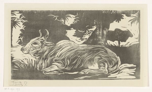 Curator: Here at the Rijksmuseum, we have "Geit," or "Goat," a woodcut and drawing created by Emilius Wilhelmus Dehé, sometime between 1896 and 1931. Editor: Well, my immediate impression is one of tension, maybe even frustration. The goat’s mouth is open, it looks like it's bleating, maybe even screaming, against the stark, dark background. Curator: That's an interesting point, because if you examine it historically, representations of farm animals in art, particularly during this period, are loaded with social commentary. The relationship between rural life, labor, and exploitation were very charged. Editor: Absolutely, and given the time frame, we also must read that dynamic of power with relation to increasing industrialization. I wonder about this goat's specific experience of gender. Curator: Interesting thought. While the drawing captures a realistic depiction of a goat, down to the texture of its fur and its lean physique, it also projects something symbolic. I want to know about the politics of the art market then. How did figuration like this position itself in opposition to more modern art movements? Editor: The politics are certainly complex! Did this artist have specific activist inclinations we should be aware of to influence the viewer's perspective? Curator: Well, the impact of this work on the community may reflect larger political discussions, particularly for agricultural policy. Considering what institutions collected similar artwork also gives insights on class and aesthetic tastes. Editor: These kinds of glimpses offer a much more layered viewing experience. Thank you for sharing! Curator: Indeed. And through that, hopefully we can invite meaningful dialogue and a re-evaluation of power structures, artistic creation, and critical engagement.