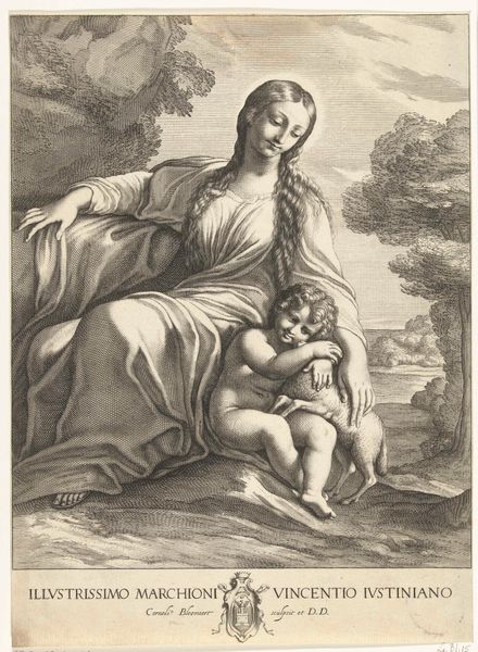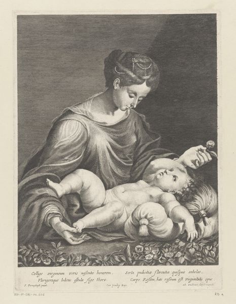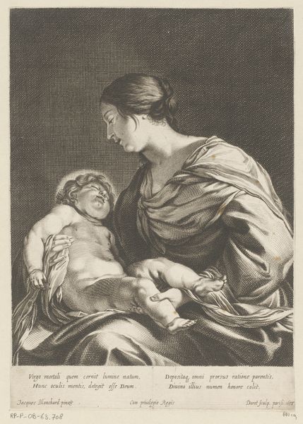 Curator: Here we have "The Virgin and Child," an engraving crafted around the mid-18th century by Giovanni Bottani. The print offers a touching depiction of the Madonna and infant Jesus. Editor: My first impression is the overwhelming sense of tenderness, a quiet moment. The lines are so precise; you can almost feel the softness of their embrace despite the starkness of the engraving. Look at the details in the drapery, how laboriously the engraver worked this. Curator: Indeed. Bottani was working within a well-established tradition of depicting the Virgin and Child, and we can certainly see the influence of Baroque ideals here in the flowing lines and dramatic composition. It was a common theme, reproduced and circulated widely, so understanding the socio-political purpose behind the images becomes extremely important to understanding it. Editor: Agreed, that mass production element of this devotional image is fascinating. The lines aren't just lines, but the result of material processes, ink on paper through a carefully etched metal plate. Look at the lines – the variety in their thickness and density, see the subtle shadows. We must consider who would've been creating these prints and to whom these objects were being circulated and by whom. The networks involved... Curator: Absolutely. It speaks volumes about the democratization of religious imagery during that period, allowing individuals from various social strata to access and contemplate sacred subjects in their own homes, as the market for this material rapidly increased in Europe during that period. Editor: It is incredible when considering the hours someone put into it. This wasn't just art. It was a craft, labor, faith made visible. It offered devotional accessibility, both practical and affordable for so many. Curator: Looking closer at the Virgin’s face and Jesus halo it adds another dimension to its public appeal. Bottani creates this compelling image steeped in tradition but ready for circulation, shaping how individuals perceive their place in relation to this iconic biblical relationship. Editor: Considering its origins, tracing these lines tells a tale of faith transformed through manual skill. It shifts perspective to acknowledge the craftspeople and processes inherent in creating what became popular visual and spiritual touchstones. Curator: Ultimately, this piece exemplifies the powerful role of imagery in disseminating faith and influencing societal values during the 18th century. Editor: Yes, it allows us to reflect not only on the art but also on those who crafted it by hand and how its very creation connected the public to faith in more hands-on ways.