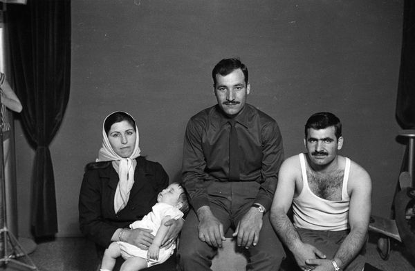 This work is one of a series of black and white silver gelatin photographs of varying sizes that are collectively titled Objects of study/The archive of studio Shehrazade/Hashem el Madani/Studio Practices. All of the photographs were taken by the Lebanese commercial photographer Hashem el Madani between 1948 and 1982 and compiled into the present group, 117 of which are in Tate’s collection, by the Lebanese artist Akram Zaatari. All of the photographs include people, either alone, in pairs or in small groups, and most were taken in Madani’s studio, although some were shot outside and in his subjects’ homes. The series features men and women and covers a wide age range from babies to elderly people. Almost all of the sitters assume poses deliberately for the camera, sometimes accompanied by props or costumes, and most gaze directly towards the lens. Many of the pictures show subjects interacting in various ways, including embracing, kissing and acting out scenes, such as a mock wrestling match. The photographs are mostly tightly cropped, with the sitter or sitters filling most of the frame, although in some cases the figures are positioned further away from the camera, for instance when shown sitting at a table or standing behind a chair. The photographs tend to have sparse backgrounds, often dominated by a blank posterior wall. They are mounted on white paper, displayed in plain white frames and signed on the back by Madani. Many of them have been organised into categories by Zaatari – such as a group featuring men dressed as Syrian resistance fighters and a collection depicting newly married couples – while the rest are presented individually. Zaatari has stated that although he prefers these groups to be displayed together, this is not a requirement (Akram Zaatari, email to Rachel Taylor, 24 April 2008, Tate Acquisition file).