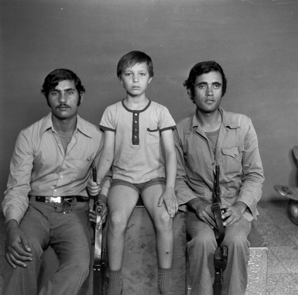 Curator: This photograph is titled "South Lebanon, 1952" by Hashem el Madani, though the artwork is credited to Akram Zaatari. Editor: There's a stark, almost confrontational quality to their gazes, isn't there? The rough wooden backdrop amplifies that sense of immediacy. Curator: Madani, a commercial photographer, captured this image in his studio. Zaatari's work involves finding and preserving Madani’s archive, giving these otherwise forgotten images a new public life. It's about access and how archives shape collective memory. Editor: Exactly. And consider the materiality of the photograph itself—the chemicals, the paper, the labor involved in its creation and reproduction, even within a commercial context. It speaks to a whole system. Curator: The very act of taking this picture transforms this family into something for public consumption, filtered through Madani's lens and then Zaatari's curatorial choices. Editor: It makes you wonder about the family’s experience, the conditions of the studio… Curator: Indeed. It's more than just a portrait; it's a document loaded with layers of history and social commentary. Editor: Absolutely. The process illuminates lives, even decades later.