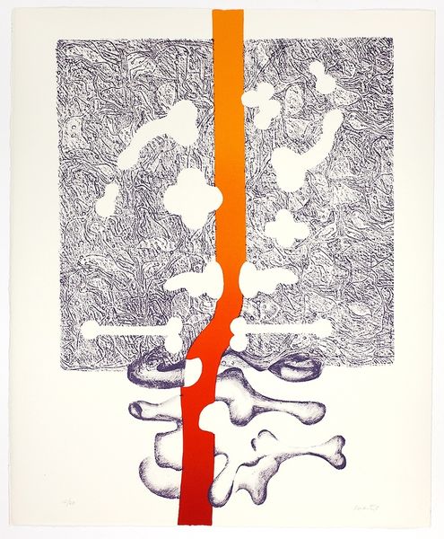 Curator: Colin Lanceley's "6. Liebestod," currently held in the Tate Collections, presents a fascinating visual puzzle. What strikes you first about it? Editor: It's disorienting yet playful, isn't it? The sharp lines contrast against the smooth gradients, creating a sense of tension, of disparate elements trying to coalesce. Curator: I agree. Lanceley's work often engages with themes of fragmentation and reassembly, reflecting, perhaps, the fractured nature of identity in the post-war era. This piece seems to echo Wagner's opera of the same name. Editor: True. And consider the composition itself. The mechanical drawings juxtaposed with organic, almost psychedelic shapes, creating a visual dialogue. Curator: Exactly, a dialogue that extends beyond the canvas. Lanceley was deeply influenced by mythology, literature, and his own personal experiences. Editor: Looking closer, the meticulous line work suggests a kind of precision while the colorful shapes evoke a sense of freedom. It's a delicate balance. Curator: A balance, perhaps, between control and chaos, between the individual and the collective. Lanceley’s personal symbolism feels almost impenetrable. Editor: Precisely! It's the interplay between these elements that makes the artwork so compelling. Curator: An encounter with Lanceley's "6. Liebestod" is a journey of questioning. Editor: And an opportunity to appreciate the power of visual language and symbolic juxtaposition.