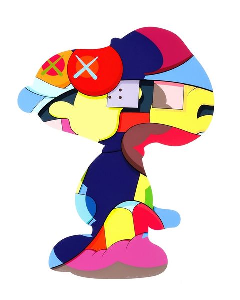 Kaws, born in 1974, made this ‘After Limbo’ painting with smooth, flat color and bold, graphic shapes that feel both familiar and unsettling. The surface is so uniform; there's no trace of brushstrokes, no visible texture, as if it was printed. And this flatness is key, right? It's like looking at a cartoon, but a cartoon about melancholy. Those X-ed out eyes, that slumped posture, it’s heavy. But then, the bright orange pops, offering a jolt of warmth against the otherwise cool palette. It reminds me of Warhol's screen prints but with a contemporary twist, blending street art aesthetics with fine art sensibilities, creating something that's both accessible and thought-provoking. I love how Kaws embraces ambiguity; the painting doesn’t tell you what to feel, it just invites you to feel something.