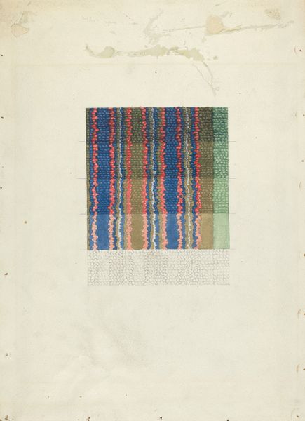 Curator: This work, simply titled "Textile," dates from between 1935 and 1942, and it appears to be an anonymous design rendered in pencil and some red ink on paper. What’s your initial impression? Editor: The repetition of those geometric, almost floral, motifs is immediately striking. It has an ancient, ritualistic quality, like something unearthed from an archaeological dig. Curator: Precisely! Consider that textiles have always been integral to human survival and cultural expression. This drawing provides a crucial insight into how pattern and design informed daily life during that period. We see an intersection of planning and production. Editor: The motifs are interesting. They seem both abstract and figurative simultaneously – reminiscent of abstracted floral forms or maybe even stylized bird wings. It evokes a feeling of nature translated into cultural symbol. Did such patterns have a specific symbolic meaning in the cultures from which they emerged? Curator: That’s a crucial question. Though unsigned, the execution speaks to both functionality and inherent artistry. Notice how the horizontal bands divide the composition. We see rhythm and structure suggestive of the weaving process itself. Each section reflects stages of production, where the means becomes part of the end. Editor: Right, each of the motifs in these registers are also set in horizontal patterns, in alternating layers, emphasizing repetition, a visual representation of collective cultural values or shared symbolic vocabulary perhaps. It could reflect cultural memory, or act as visual mnemonics tied to historical events or mythological narratives. Curator: Furthermore, its existence on paper suggests a conscious effort to document and preserve this cultural knowledge. Editor: The very act of planning a textile design becomes a kind of symbolic gesture, then. It reinforces identity, doesn't it? What's intriguing to me is what such a piece was purposed for - its utilitarian value, perhaps a way to convey historical narratives? Curator: That resonates strongly. Studying "Textile" allows us to decode the underlying values assigned to functional objects of this kind. The relationship between aesthetic appreciation and essential labor is what remains compelling to this day. Editor: I agree. It leaves one wondering what stories these abstracted forms are meant to convey. Curator: The way it invites you into its symbolic depths truly exemplifies art and design in practice, then and now.
