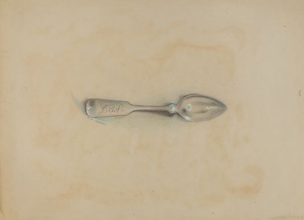 Editor: So, here we have Kalamian Walton's "Silver Teaspoon," drawn around 1936. It’s a pencil or graphite drawing of, well, a teaspoon! It's simple but striking. What strikes me most is the attention to light and shadow in something so everyday. What do you see in it? Curator: It's a very compelling study in materiality. What makes this more than *just* a drawing of a spoon? It's the labor involved, isn't it? Consider the industrial processes that formed the actual spoon itself, the mining of the silver, the shaping, the engraving – all that is invisibly present. And then, superimposed, is the artistic labor: the artist’s hand meticulously recreating the spoon's form, its reflective surfaces, with graphite on paper. Editor: That’s a really interesting way to put it, I hadn’t thought about the spoon itself as an industrial object! So, by drawing it, Walton is commenting on the production process, maybe the everyday beauty that often goes unnoticed in mass production? Curator: Precisely. The 'amateur sketch' quality actually enhances this. It resists elevating the spoon to a symbol of wealth or luxury, focusing instead on its inherent form, its purpose, and the many hands, both artistic and industrial, that brought it into being. Think about the consumer, too – someone used this spoon, valued it enough to have it engraved, maybe even cherished it. What was its role in the cycle of production and consumption? Editor: So it becomes this sort of layered object, reflecting not just light, but also labour and social history! It gives so much depth to what initially seems like a simple sketch. Curator: Exactly! It challenges the high art/low art divide by looking intently at a mass-produced, utilitarian object. Now, does knowing all that change your initial impression of the drawing? Editor: Definitely. I see a lot more than just light and shadow now! I’ll never look at a still life the same way. Curator: Nor will I!