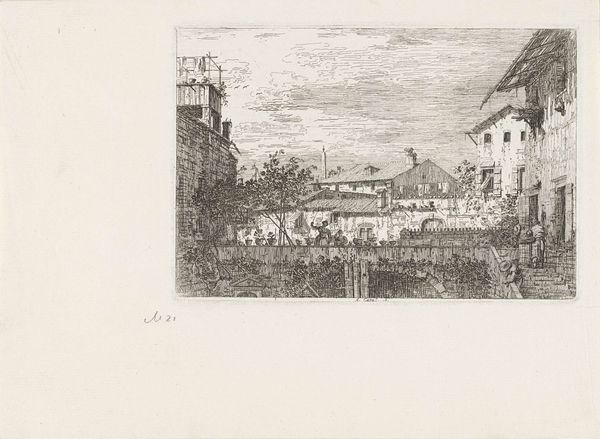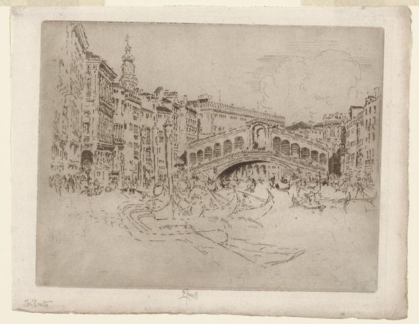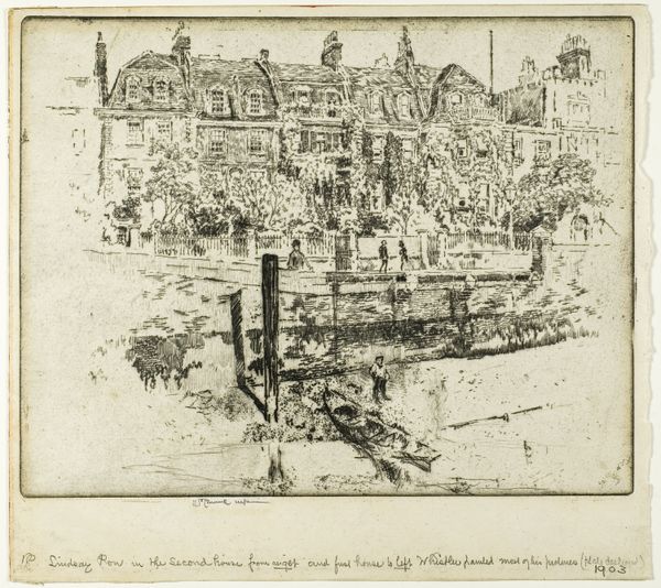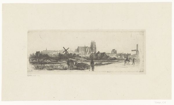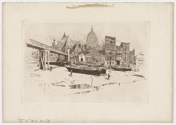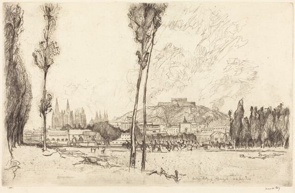 Curator: Here we have Joseph Pennell's etching, "Beauvais from the Boulevard," created in 1907 and part of the Minneapolis Institute of Art collection. Editor: My immediate impression is one of profound peace. It’s rendered in delicate lines, giving a sense of looking at a memory. Curator: Indeed, Pennell masterfully uses the etching technique to create a scene dominated by a quiet geometry. Note how the lines converge, directing your gaze toward the magnificent cathedral in the background. Editor: The cathedral absolutely dominates the scene, doesn't it? It acts as a clear symbolic anchor, drawing a line between the earthly dwellings below and the divine. I find myself thinking of the role of the church throughout the region's history and the values it represented. Curator: Certainly, but I would add that the intricate linework depicting the urban structures below – the rooftops, streets – possess a beauty of their own. There's a compositional tension established between the grounded nature of the immediate landscape and the ethereality of the cathedral looming behind. Editor: Yes, and the artist's decision to present Beauvais from an elevated vantage point provides an all-encompassing view. Symbolically, this implies not just physical observation but a conceptual comprehension of place. Curator: The muted tones characteristic of etching also lend an essential softness. This adds a textural dynamic at play, enriching the formal elements. The use of value, with those deep shadows juxtaposed with lighter, sparse markings, constructs volume, especially in the structures closest to us. Editor: The soft, almost dreamlike, rendition really emphasizes that feeling of temporal distance, creating a connection between the past and present and emphasizing permanence amidst change. It makes the historical narrative embedded within this image so powerful. Curator: On that note, considering both the symbolic and the formal, this etching reveals to us that both beauty and power are intrinsic in this place, Beauvais. Editor: And that's what Pennell has captured with enduring sensitivity. It is truly evocative.