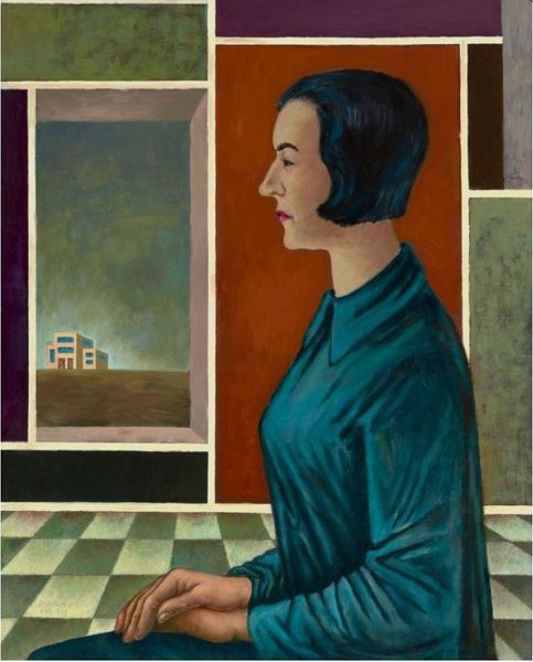 Editor: This is Rita Angus’ "Portrait of Betty Curnow," painted in 1942 using oil on canvas. It's currently housed at the Auckland Art Gallery. What strikes me is the flatness and almost naive realism; it’s both intimate and oddly detached. What do you see in this piece? Curator: Intriguing observation. Formally, I'm drawn to the painting’s deliberate structuring of planes and patterns. Observe the subject's face, rendered with a direct gaze and minimized shadowing, emphasizing the surface quality of the paint itself. How does the patterned blouse interact with the geometric background? Editor: It creates a visual tension, a busyness against the order of the shelves and framed pictures. Curator: Precisely. Note the layering of geometric shapes: rectangles of the books and picture frames. The artist manipulates colour to flatten the image, bringing foreground and background into a unified plane, and dissolving traditional perspective. Editor: So you're seeing it as a study of shapes and form more than as a realistic portrayal of a person? Curator: It's not either/or, but both. The subject is certainly present, yet the portrait transcends simple representation. Look at how the colours, like the contrasting red of the shirt and green of the skirt, assert themselves independently of the subject matter. Editor: I see that now, especially in the rendering of the hands. So the interplay of geometric forms, surface texture and color become the focal point, telling a different story than a straightforward likeness. Curator: Yes, the portrait uses the figure as a foundation upon which the artist can experiment with formal elements, prompting us to consider the very nature of representation itself. Editor: It definitely encourages you to really *look* at it, instead of just glancing. I'm glad to have seen the painting this way. Curator: Indeed, analyzing the formal structure has unveiled new facets of this work and the artist’s underlying aims.