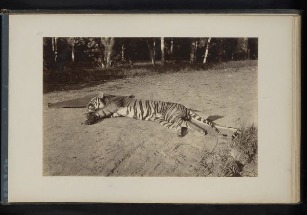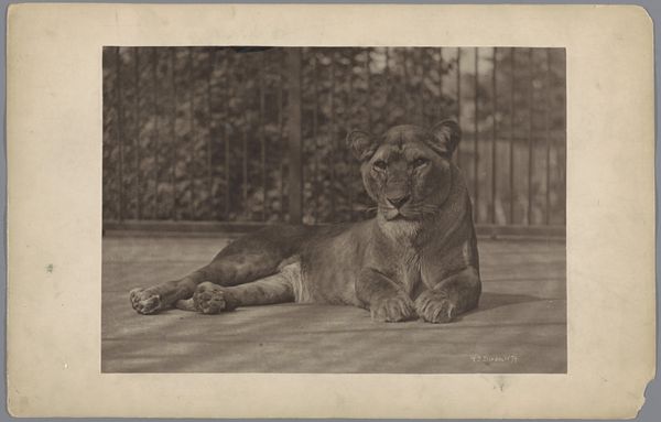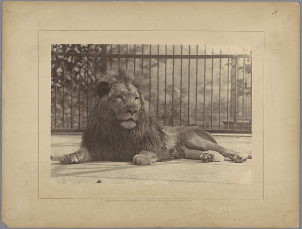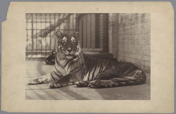 Curator: This captivating image before us, entitled "Tiger in a Zoo," was captured around 1880. This gelatin silver print can be found at the Rijksmuseum. Editor: The tiger looks…bored. I mean, monumentally bored. It’s regal, yes, those stripes and the intense stare. But the eyes hint at a profound weariness. Curator: Indeed, that sense of weariness seems tied to the setting itself, doesn't it? Consider the symbolism of the cage in the background—the geometric bars juxtaposed against the organic, fluid lines of the tiger’s body. It speaks volumes about captivity and lost freedom. Editor: Absolutely! The photographer, whose name we, sadly, don't have for certain...really captured a creature robbed of its essence. Look at how its paw just lies there. The bars seem to be visually pressing the life out of it. I imagine what life was before he was imprisoned in such a place. Curator: The realism of the photograph also highlights the changing perception of nature during the late 19th century. Zoos became popular, reflecting both scientific curiosity and a desire to control the natural world. This image then becomes an unintentional critique. Editor: Yes, a stark portrait, or even warning about our relationship with wildness, a bit melancholy if you ask me. Also, is it just me, or can one feel how he is just posing there? I bet there was somebody there giving directions like a Hollywood diva. Curator: Perhaps. And I see your point about posing. The rigidity of the composition almost enhances the sense of artificiality—this is nature mediated, curated for display. The fact that its title points to the tiger being at a Zoo supports your observation, making us more aware of this artifice. Editor: The tonal range, almost sepia, adds to the antique feel but doesn't hide the reality of those sad eyes staring right at us. It’s haunting in a very subtle, civilized kind of way. Curator: And it reminds us that images can be both documents of a time and profound commentaries on the human condition. The symbolism is inescapable, making the viewer confront uncomfortable truths. Editor: For me, it makes me feel I've committed a wrong I am not able to revert. So much history packed into this silent observer behind bars! A truly moving encounter!