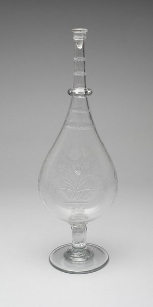 Editor: This delicate glass vessel, called "Covered Bowl," dates back to somewhere between 1880 and 1900. The pear-like shape strikes me, especially the way the handle mirrors a fruit's stem. It’s so simple, yet captivating. What are your initial thoughts on its formal qualities? Curator: The most salient formal element is indeed the pear-shaped structure itself. Observe how the smooth, continuous lines define the volume, and how the glass transitions from clarity to a softer, almost frosted opacity near the apex. The curve of the "stem" or handle provides a crucial counterpoint to the main form, an artful asymmetry. Editor: I hadn't thought about that contrast, between the clear glass at the bottom and the opaque top! Why do you think the artist chose to render those portions differently? Curator: From a purely formal perspective, the differentiation enhances visual interest, offering variations in light diffusion and reflection. The clearer glass emphasizes the interior space, while the opacity atop draws attention to the piece’s contours. We are invited to consider how shifts in the medium's inherent qualities influence our perceptions. Editor: It’s like the glass itself is the story, with the stem providing an interesting pause. The bowl feels almost complete and pure somehow. Curator: Precisely. Every detail reinforces the core structural concept, making this object a compelling exercise in reductive elegance. Editor: Looking at it now, it is so clever! I didn’t fully see the attention to detail on my first look. Thank you.