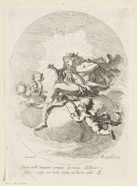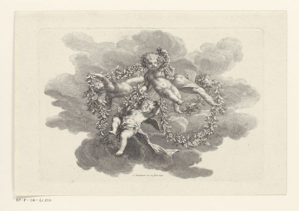 Curator: Here we have Carlo Innocenzo Carloni's "Putti Holding Flowers," an engraving dating back to between 1725 and 1775. Editor: My immediate impression is one of lightness and delicacy. The cherubic figures, almost floating, seem to dance on the surface. The monochrome tones create an ethereal, dreamlike quality. Curator: Indeed, Carloni, likely in collaboration with Johann Daniel Herz, skillfully employs line work to convey both form and texture. Notice how the varying density of the lines gives depth to the putti and the floral arrangement they carry. What strikes me is the artisanal labor involved in engraving; the painstaking process. Engravings were often used to disseminate images, democratizing access. This challenges the common narrative around aristocratic art. Editor: It makes me think about how depictions of childhood and innocence are, culturally, potent ideological symbols. These aren't simply cute babies; they embody ideas of purity, potential, and even the divine. We could examine the symbolism within the blooms; they're held aloft as if offered or presented to us, asking for our engagement in this innocent form of symbolic understanding. It brings into question a period defined by monarchy and class, juxtaposing pure and the corrupt. Curator: Exactly. These prints weren’t necessarily valued as high art but served more as functional tools. Studying such materials in their original context reveals a web of influence, skill, and consumption—and this shifts focus from romantic ideas about the artist’s creative vision, as separate from societal factors and market pressures. Editor: Looking closer, the implied action captures the shifting social attitudes towards childhood in 18th-century Europe. These were products intended for circulation, consumed within networks both defined by leisure and those in developing industrial centres. What do those shifts towards domesticity tell us about women of this time and their place in social frameworks of consumption? Curator: Absolutely. This was not just about art hanging on a wall. We gain a much fuller picture. Thanks to these layered networks of creation, distribution, and utilization, we've had a great chance to learn here about how images could traverse social boundaries and impact ideas. Editor: I couldn’t agree more, that has deepened my understanding so much, not only of the era, but our changing understanding of access.