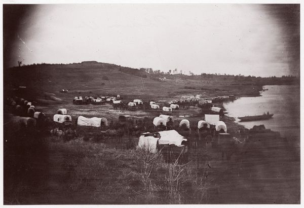 Curator: Standing before us is James Craig Annan's "A Lombardy Pastoral," a print created in 1894. Editor: It's remarkably serene. The composition, predominantly horizontal, gives it a sense of expansive stillness. Curator: Annan’s work often engages with established artistic traditions through the lens of the then-new medium of photography. This one certainly shows how he elevated photography as an art form. Editor: The flock of sheep dominates the scene, certainly a recurring symbol of peace and simplicity, invoking biblical pastoral traditions but it also seems to represent the working classes, bound to repetitive tasks. Curator: And note how the arrangement of the sheep – massed towards the right and thinning out as the perspective moves left—creates depth and guides the eye across the plane. It is simple and subtle at the same time. Editor: Absolutely, their placement pulls you into the background scene. The shepherds appear as central silhouettes that really serve the double meaning. But tell me, do you notice how the landscape sort of watches over them like protectors of this way of life? Curator: It's an interesting tension. This visual weight implies a power balance; one almost detects Annan hinting towards a relationship between landscape and its inhabitants. The subdued palette further underscores the scene's tonal harmony. Editor: Tonal harmony is spot on. The limited range adds to the tranquility, creating a sense of timelessness but, thinking again, maybe there is something somber about the tonal values and quiet mood, speaking to labor exploitation through that pastoral life metaphor. Curator: That very well could be; ambiguity makes this a compelling composition. The soft focus lends it a dreamlike, almost idealized, quality. Editor: The beauty of this work lies in its delicate balance. Annan creates a world where tradition and modernity, representation and metaphor intersect, leaving viewers with a haunting vision of a pastoral existence. Curator: Indeed. The structure leads to various, compelling interpretations. Editor: A work like this invites one to wander between seeing and believing.