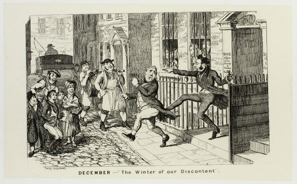 Curator: "June - Marrowbones and Cleavers," made by George Cruikshank sometime between 1839 and 1880. This print is one from a series of etchings for "The Comic Almanacks". Editor: It's got a lively chaos to it. All that frantic energy caught in pen and ink. There’s a great tension created by the angularity of the lines and the strong contrasts between light and shadow. Curator: Indeed. Cruikshank was a master of social satire, and this piece gives us insight into street life and popular culture during the period. The title refers to butchers' music made with bones and cleavers on St. Barnaby's Day. Editor: The composition is a whirlwind. My eye is drawn to the central figures, particularly the man wielding what looks like an axe, then flickers to the frightened onlookers. Curator: Exactly. These almanacks, popular in their time, provided entertainment and commentary for a broad audience, often with pointed satirical jabs at social norms. They helped disseminate ideas. Editor: I see. Looking at it purely formally, the deep blacks accent the violence of the action while those hurried pen strokes almost amplify the scene's agitation. It has the urgency of reportage, if such reportage were deeply stylized. Curator: The expressions are exaggerated and are typical of Cruikshank's style and the culture of caricature at the time, reflecting perhaps how the elites wanted to frame such lower class displays as unhinged and comical. Editor: Right! And look how he’s used the hatching to define forms, creating a surprising depth despite the flatness inherent in the medium. See how those white spaces function almost like miniature spotlights! It’s incredibly skillful. Curator: Think about who was consuming prints like this; prints intended for mass consumption helped foster a sense of shared identity and social commentary during the Victorian era. Editor: It certainly provides a lot to think about. This work has shown me how careful arrangement of light and dark creates something dynamic. Curator: It is important to reflect how such accessible art played an important role in how the British perceived their own culture and society in those days.
