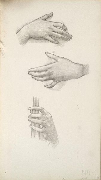 Editor: This drawing is "Studies of the Hands of Erasmus of Rotterdam" by Hans Holbein the Younger, created in 1523. It’s made of pencil, and the detail is captivating. What do you see when you look at this piece? Curator: Holbein’s drawing gives us an intimate glimpse into the world of intellectual power during the Renaissance. Erasmus was not just any scholar; he was a towering figure whose writings shaped religious and political discourse. Holbein's studies present Erasmus’s hands, tools of his trade. The careful observation speaks to the value society placed on scholarship, literacy, and communication at the time. Editor: So, it’s about the societal importance of writing? Curator: Exactly! Consider that Holbein made this drawing in preparation for a painted portrait. The hands weren't mere details; they symbolized Erasmus's identity and the power of humanist thought. They show him in the act of creation and are meant to convey his intelligence. Editor: The hands almost look like portraits themselves. Did Holbein usually give hands this much attention? Curator: Yes. He captured sitters beyond physical appearance, reflecting status, values, and roles within society. Think of the politics of imagery. By emphasizing hands so precisely, Holbein elevates Erasmus beyond a mere likeness to an icon of humanist thought. Consider the symbolism – are they the hands of a scholar, or something more? Editor: That's interesting, it makes me consider who gets portrayed in such detail, and why. Thank you for helping me view this work in its historical context! Curator: And you helped me remember the subtle art of portraiture as propaganda! It shows the important intersection of art and socio-political power.
