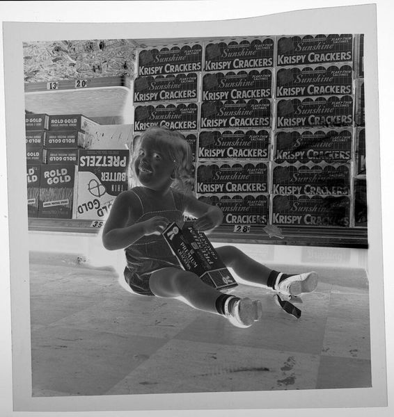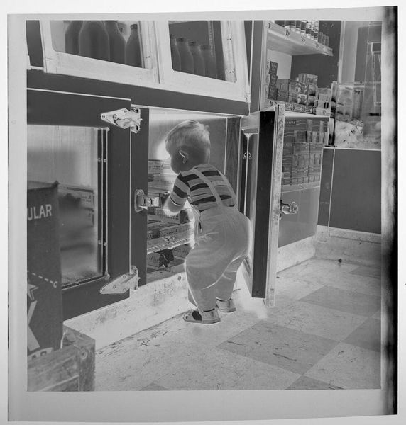 Curator: This image by Jack Gould, "Untitled (small boy looking at cans on display in supermarket)," captures a seemingly mundane moment. The stark black and white tonality creates a rather somber mood, doesn't it? Editor: Yes, the light and shadow lend it a gravity that belies the subject. The child dwarfed by the endless rows of canned goods speaks to post-war consumerism and the construction of childhood within that landscape. Curator: I'm drawn to the formal repetition of the cans, creating a grid-like structure that both contains and overwhelms the figure. The composition directs the eye to the boy, who is perfectly centered. Editor: Absolutely. It also raises questions about access, class, and the commodification of basic needs. The child's gaze is directed at a wall of processed food, a commentary on the manufactured nature of sustenance. Curator: The photograph is a successful arrangement of shapes and textures. Editor: I agree, and beyond that, it subtly critiques the societal structures that frame even a child's perception of the world. Curator: It's amazing how much can be seen in such a small image. Editor: Indeed, a poignant reflection on consumer culture and its impact.