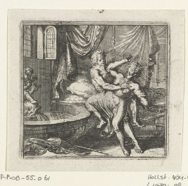 Curator: This intriguing piece before us is an etching and engraving crafted in 1697 by Romeyn de Hooghe. The artwork is an Illustration for Boccaccio's Decameron. Editor: The sharp contrasts create a dramatic mood. Look how the candlelight emphasizes the subjects' intimate setting, and also contributes a sense of suspense. Curator: De Hooghe's illustrations played a crucial role in shaping public perception of historical and literary narratives like Boccaccio's. This print is a glimpse into how the late 17th-century viewed and consumed such stories, highlighting evolving social norms regarding eroticism and morality. Editor: Formally, I find the composition compelling, with the architectural structure dividing foreground action and background inaction to create two levels of voyeuristic appeal. The textures achieved through cross-hatching are amazing. Curator: And don't forget the historical context. Boccaccio's Decameron was already centuries old at this point. De Hooghe's work represents an interesting intersection of the Renaissance with the burgeoning visual culture of the Baroque era. Editor: The single candle becomes such a key semiotic element, and you can see in the image the careful attention paid to the folds of fabric. But that stark, almost clinical light, contributes so much to the overall reading of the piece, wouldn't you agree? Curator: Absolutely. By revisiting the classic tales within a Dutch socio-political framework, de Hooghe engaged audiences with themes of love, desire, and societal values. The popularity of such imagery says much about the social climate of the time. Editor: It's precisely this dance of light and shadow, framing this intimate tableau, that arrests the viewer. Curator: Analyzing prints like this from de Hooghe allows us to access and contextualize a pivotal point in art and literature's cultural journey. Editor: It seems even in monochrome, color emerges—through gradations, light, and detail, it speaks so profoundly to form.
