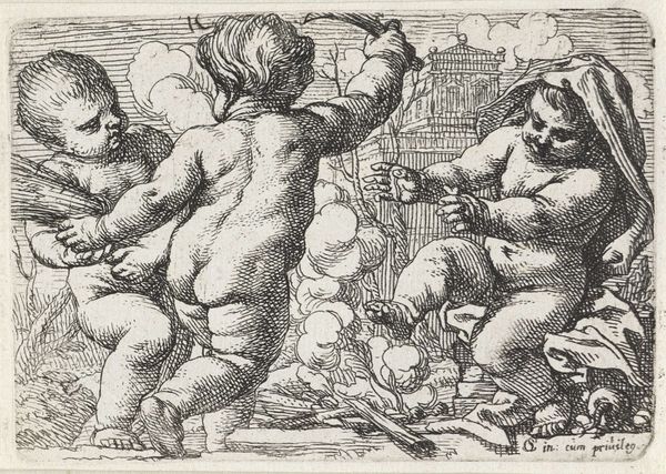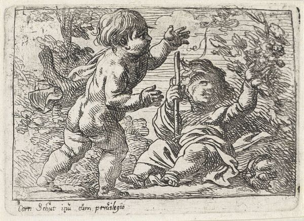 Cornelis Schut created this print, "Two Nude Children with a Lamb," sometime in the 17th century. Two cherubic children playfully adorn a lamb with a garland of grapes, a scene imbued with layers of symbolism. The lamb, a symbol of innocence and sacrifice, has roots stretching back to ancient sacrificial rites and early Christian iconography where it represents Christ. Here, the lamb is not presented as a sacrificial figure, but as a gentle companion. Similarly, grapes, often associated with Bacchus and revelry, also appear in Christian art as symbols of the Eucharist and spiritual nourishment. Observe how Schut intertwines these classical and religious motifs, subtly shifting their meanings. This image evokes a sense of pastoral harmony, yet carries echoes of deeper, often conflicting, cultural memories. It invites us to consider how symbols persist and transform, engaging our subconscious as they resurface across epochs.