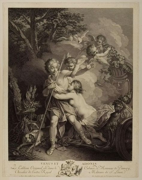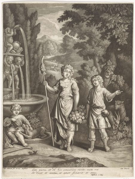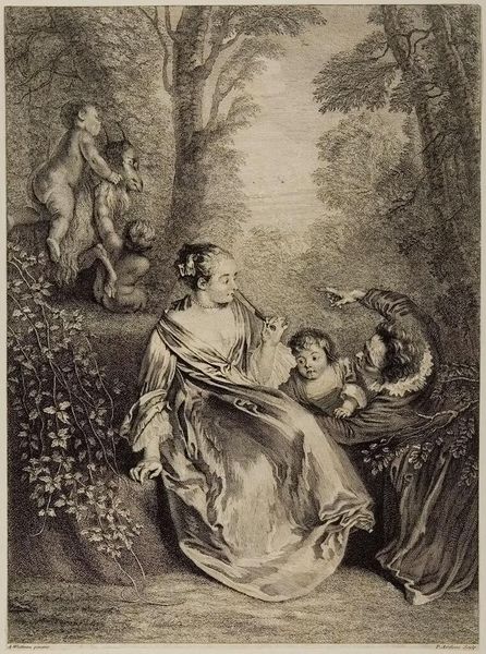 Curator: Isn't it charming? This is Jacques Firmin Beauvarlet's print, "Charles Philippe (Charles X.) at Age Six with his Sister Clotilde at Age Four, with goats." Look at how the kids are riding the goats! Editor: It has a delicate, almost dreamlike quality, doesn't it? The landscape is soft, yet those little figures are so meticulously rendered. Curator: Beauvarlet was a master of engraving, and here he's captured the innocence and privilege of childhood, placing the young royals in an idyllic setting. The goat, of course, often symbolizes abundance and prosperity. Editor: And obedience, too. The goat carries them, like a good servant. It's fascinating how Beauvarlet combines these seemingly contrasting ideas of natural innocence and social structure. Those goats, symbols of bounty, are literally burdened by royalty. Curator: It is quite the statement! The careful detail, the symbolism, all crafted to present a certain image. Editor: Images that spoke volumes then, and continue to resonate now. The weight of expectation, even in childhood.