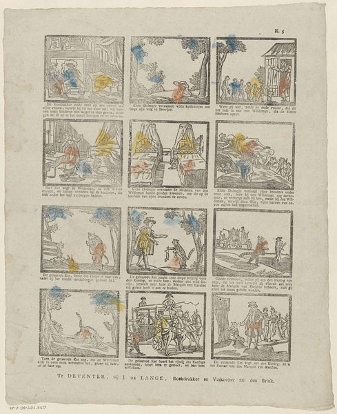 This print, made by L. Lazare, is a hand-colored engraving. It shows twelve vignettes on a single sheet of paper. The use of engraving, a printmaking technique, suggests a desire to disseminate imagery widely. Each scene is lightly daubed with simple colors – yellow, blue, and red – giving a sense of accessible charm. The visual language here is not one of high art, but rather belongs to the realm of popular imagery. The artist was a ‘negociant in papieren en kantoorbehoeften’, meaning a dealer in paper and office supplies, indicating a commercial context. This tells us that the images were destined for everyday consumption, rather than an elite audience. Look closely, and you'll notice the simplicity of line and form. The scenes appear almost like templates, ready to be filled in with the imagination of the viewer. In its use of accessible materials and making processes, this print exemplifies how art can be deeply embedded in the routines of daily life.