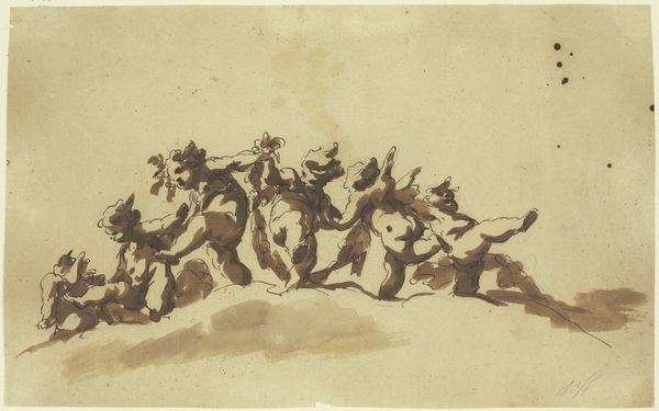 Curator: Here we have Stefano della Bella's "Two Figures on Horseback, a Soldier Walking Behind," created sometime between 1600 and 1700. This artwork, a delicate drawing and print, resides here at The Met. Editor: My initial impression is one of subdued motion, like a half-remembered dream of fleeing through a landscape. The figures seem almost translucent, barely there. It's strangely haunting. Curator: The composition is rather intriguing. Observe how the figures are positioned; the horse and riders dominate the center, the walking soldier on the left mirrors the smaller indistinct shapes on the right, yet there's a clear distinction in weight and detail, guiding the viewer's eye through the scene. The linearity here is key. Editor: It feels unbalanced to me, or maybe "yearning" is a better word. Like the figures are searching for something just beyond the edge of the visible. I keep wanting more detail to resolve in the distance. I wonder what story Bella meant to suggest. Are they running away? Toward something? Curator: Given Della Bella’s background in printmaking and his influences from the Baroque period, it is safe to analyze this piece as a moment of visual story-telling rooted in form, rather than in concrete, narrative terms. Look at the way he uses the etched line to denote both form and shadow. Note, especially, how depth is merely suggested; we can easily see the layering. Editor: That starkness, that feeling of incompleteness you mention – maybe that’s why it resonates. Life never feels finished, does it? Always searching for resolution. It reminds me a little of unfinished symphonies and how potent and eternal those feel. I imagine Bella working furiously in the studio to conjure a world of feeling in stark detail. Curator: Indeed, that evocative tension stems, in large part, from its structural properties—the delicate lines that both define and dissolve the subjects. Editor: Absolutely, its emotional punch comes from his masterful control and abstraction in line and form. I feel a kind of deep nostalgia looking at the figures. Curator: Perhaps. In either reading, what persists in the Baroque interpretation of Stefano della Bella's, "Two Figures on Horseback, a Soldier Walking Behind," is his clear formal dexterity and technical execution. Editor: In the end, I appreciate it is incompleteness: not an ending, but a feeling.