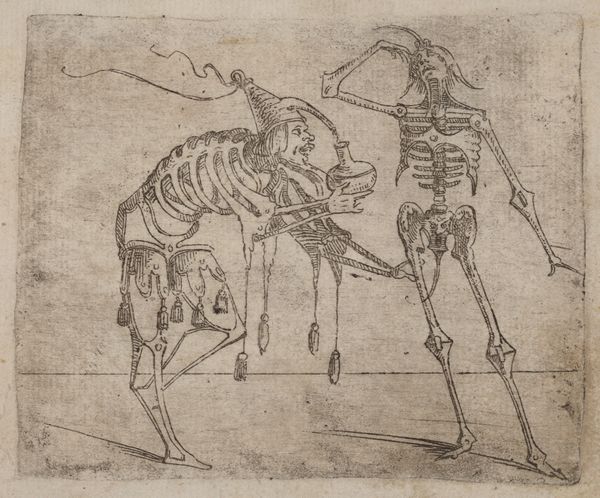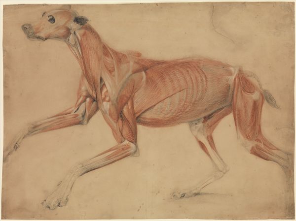 Curator: Here we have 'Skelet van een paard' – 'Skeleton of a Horse'–a drawing in colored pencil, sketched sometime between 1891 and 1941, by Leo Gestel. What strikes you when you first see it? Editor: Death! Stripped bare. The horse appears to be decaying right before our eyes, like an anatomical study meets an existential nightmare. It is raw, honest, and surprisingly touching. Curator: That raw honesty, I think, comes from the way Gestel marries figuration with a skeletal structure, it's not just representational, it’s revealing the underpinnings, quite literally. The strokes themselves add another layer – their simplicity gives it a very grounded feel, despite the grim subject matter. Editor: Absolutely, consider the line work. The energetic yet spare strokes create the volume, emphasizing the interior space through absence and shadow. Semiotically, the lines almost act as indexical signs of a physical presence that is disappearing, making the image less about "horse" and more about mortality itself. Curator: And there’s something beautiful in that too, isn’t there? The landscape isn’t grand, the horse isn't living, yet there is a strangely compelling beauty here. It speaks of endings, but perhaps also new beginnings. Maybe that’s a stretch? Editor: Not at all. I find that, structurally, Gestel used a very minimal tonal palette: it contributes to a very earthy almost sanguine presentation. These warm browns and ochres that bring warmth out, even amid the skeleton. I wonder if it is, perhaps, symbolic to an afterlife in nature? Curator: Or it could even just be a meditation. Death might be final but the bones and traces can last lifetimes and even longer if preserved, and remind us that existence has value, no matter how brief or how complete. It might just remind you how fragile things are, what a tender subject Gestel chose, wouldn't you agree? Editor: Well, pondering about semiotics and color symbolism will only carry me so far...Ultimately, for me, Gestel's skeletal horse is both a study in form and a profound contemplation on being and nothingness. Thank you for opening my eyes.