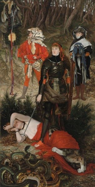 Franz von Lenbach painted "Marion Lenbach in Knight’s Armor" with oil on canvas sometime in the late 19th century, and there’s something so charming in this portrait of a child playing dress-up! Look at the way Lenbach renders the gleam of the armor. It's not about precise detail; it’s more about the feeling of light bouncing off the metal. It gives it a kind of immediacy, as if he’s capturing a fleeting moment. It’s all brushy and suggestive. The dark background makes the figure pop, but then the edges kind of dissolve. There's a looseness, almost an abstract quality to the way the dark background blends with the subject. That single feather on the helmet, just a tiny dab of paint, brings a kind of playful touch to the serious subject. You could imagine this work hanging alongside a John Singer Sargent or a James McNeill Whistler, artists who knew how to capture likeness but were also deeply interested in the way paint itself could become a form of expression. It shows that the conversation between the artist and the canvas is one that can always offer new surprises.