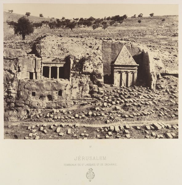 Curator: This stunning photograph by Louis de Clercq, taken around 1860, captures the Church of Saint Anne in Jerusalem. It's a powerful image of a place laden with history. Editor: It really is. The somber tones give it such a sense of weight and the rough textures, those stones scattered across the foreground... they speak of something ancient and enduring, yet maybe a little forgotten? Curator: The church's architecture itself is fascinating. You see the Romanesque influence, and the structure sits on the traditional site of the home of Jesus's maternal grandparents, Anne and Joachim. The French inscription below the image tells you the Church belonged to France, highlighting France's ambition for influence in the region during the 19th century. Editor: Right, it definitely has this feeling of being a place of significant spiritual intersection. I'm struck by the dome, that half-sphere representing the heavens, sitting atop the solid, earthly walls. A visual language reflecting both heaven and earth and the passage between them. Curator: Precisely! This area was hotly contested throughout the 19th century and owning sacred spaces lent credibility and legitimacy. De Clercq's choice to highlight this location reflects France's attempt to claim this visual association with power and faith, especially through the camera lens. Editor: Photography during this time... it becomes a tool for documenting both the tangible and the intangible, doesn’t it? Look at how de Clercq's choice to present the building creates that somber emotional connection. The symbols resonate and invite this cultural memory. Curator: Absolutely. His composition guides our gaze toward these monuments that became crucial emblems of nation-building efforts, cultural imperialism and ultimately... control. This single photograph, in the end, reminds us of that very complicated historical narrative. Editor: Looking at it this way makes you think how a seemingly simple architectural study holds layers of meanings. The architecture certainly speaks, not just in its structure but through the narratives it subtly conveys. Curator: Yes, exactly. Thank you for this reading, because this photo provides indeed a poignant commentary on a place that continues to hold such immense historical weight.