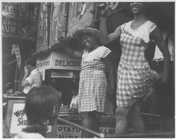 Editor: This photograph, "Impromptu Hoedown on the Third Floor of a Horse Barn" by Wayne Miller, showcases a lively musical gathering. The strong contrast between light and shadow emphasizes the energy of the scene, but I'm curious about its deeper meaning. What formal elements stand out to you? Curator: The composition is quite striking, isn't it? The convergence of lines draws the eye diagonally, from the musician at the lower left to the fiddle player, creating a dynamic visual rhythm. Notice how Miller uses the architecture of the barn itself to frame and compartmentalize the subjects. Editor: That's fascinating. I hadn't considered how the structure itself plays such a crucial role. Curator: Indeed. The interplay of light and shadow, coupled with the considered arrangement of figures, elevates the image beyond mere documentation. We are invited to consider how form dictates content. Editor: I'm starting to see how the formal aspects really shape the narrative. Thank you! Curator: My pleasure. Examining art through its structure can illuminate its deeper resonance.