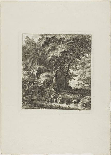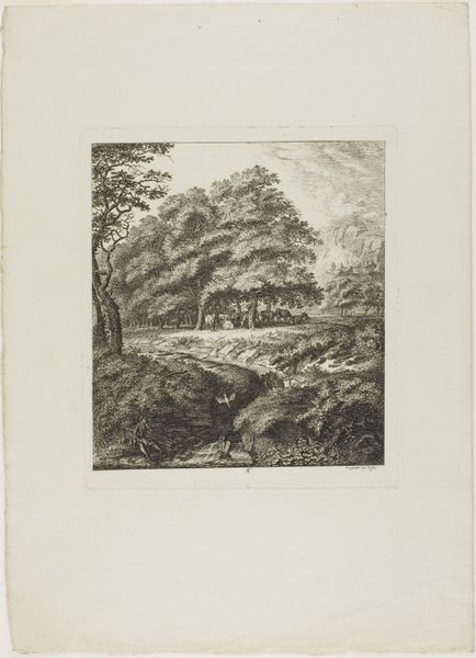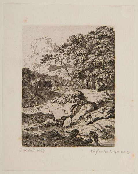 Johann Christian Reinhart created this etching, "A Subiaco, from Malerisch Radierte Prospekte aus Italien," to document his travels in Italy. Reinhart, living in Rome during a period of cultural and political upheaval in Europe, was part of a community of artists who were drawn to the Italian landscape. The print shows an idyllic vision of the Italian countryside, with a lone figure and his dog, perhaps meant to evoke a sense of harmony between humans and nature. However, it also represents a selective view of Italy, one that often overlooked the social and economic realities of the time, particularly the lives of the working class and rural poor. It creates an idealized image of the Italian landscape, a vision that catered to the tastes and expectations of a largely Northern European audience. Consider, as you look at the artwork, the stories and perspectives that might be missing from this picturesque scene. How do we reckon with the romanticized depictions of places and people, particularly when they obscure the complexities and inequalities of lived experiences?
