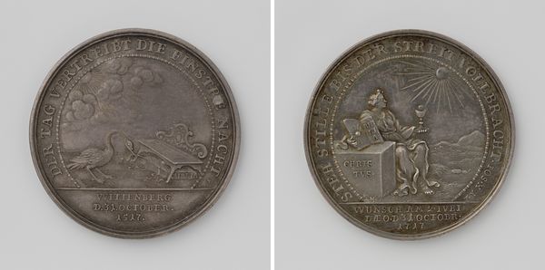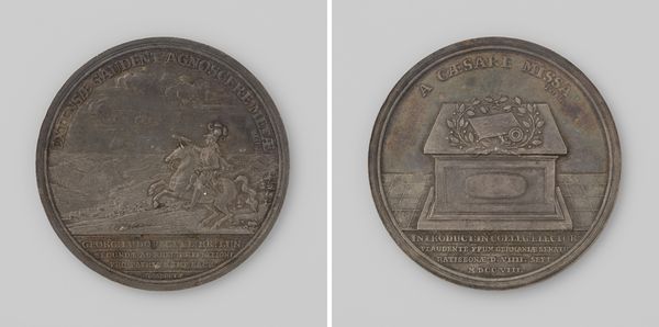 Curator: Here we have a commemorative medal from 1772, titled "Geboorte van Willem Frederik, erfprins van Oranje-Nassau," or "Birth of Willem Frederik, Hereditary Prince of Orange-Nassau" in English, by Theodorus Victor van Berckel. Editor: Immediately striking is the classical imagery and weighty, almost somber feel of the piece, despite it supposedly celebrating a birth. The stark relief gives it an aura of monumentality, but the size makes me want to handle it, to feel its material reality. Curator: The choice of metal lends to its aura of timelessness, like an artifact. One side shows an allegorical female figure holding a staff, with cherubs bearing gifts, perhaps a visual invocation of divine favor surrounding the prince's birth. Editor: Absolutely. The reverse portrays a seated woman, draped and posed rather mournfully, next to a column inscribed with a heraldic crest. The word "Securitas" arches above her…a yearning for security in uncertain times, perhaps? Who are the people the medal was made for? Curator: It speaks to the socio-political landscape in 1772, anxieties over succession are cleverly translated to enduring classical allegories of virtue, peace, and of course, divinely ordained power, thus stabilizing the Orange-Nassau claim. Editor: And who produces such objects? This "divinely ordained power" relies on patronage. And given the Baroque aesthetic, was it primarily for elite circles or the growing middle class of the time? Curator: The artist here, Van Berckel, was capturing a symbolic message destined for widespread admiration, intended to resonate with different factions. We are viewing Baroque splendor crafted into popular symbols. The family shield reminds beholders of lineage. Editor: Which prompts reflection: while seemingly created to convey power, does the need to create an artwork like this betray insecurity? Curator: That's a fascinating point. Ultimately, "Geboorte van Willem Frederik" does encapsulate hope for continuity but subtly acknowledges a need to reassure. Editor: In short, more complex times, more complex objects. I come away feeling like this is both a proclamation of authority and a desperate appeal for its legitimacy. Curator: Yes. Medals often crystallize societal undercurrents, in a tangible and symbolically powerful form.