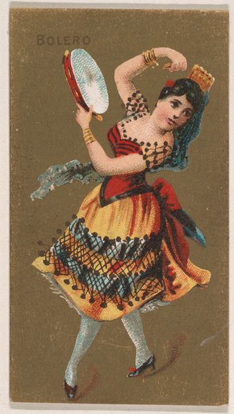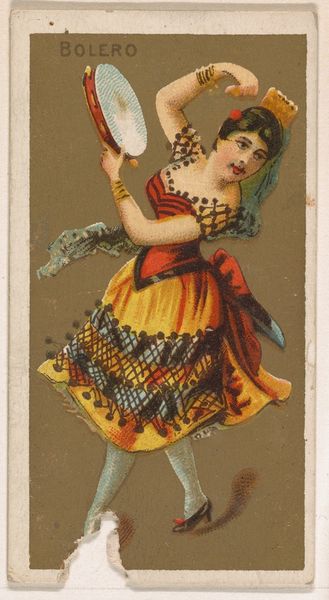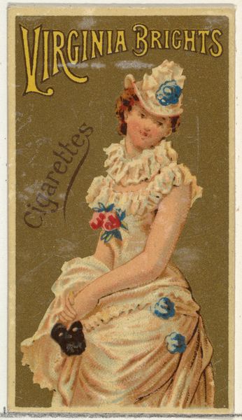 Curator: At first glance, this is just shockingly awful on so many levels; that expression on the girl’s face suggests some sort of premonition, like she just realized she’s stuck forever as cigarette advertising. Editor: What you’re describing there, is quite the cultural artifact. We are looking at “From the Girls and Children series (N58) promoting Our Little Beauties Cigarettes for Allen & Ginter brand tobacco products,” which the Allen & Ginter Company released in 1887. This portrait comes to us courtesy of the Metropolitan Museum of Art collection. Curator: A beauty, alright! Allen & Ginter apparently considered hooking kids on nicotine a way to move product? Though, looking past all that questionable marketing, it does strike me as kind of sad how we co-opted these idyllic portrayals of innocence for, well, the opposite. Editor: Indeed, she's placed within an idyllic natural setting. And yet, something feels amiss, wouldn’t you say? There is almost a ghostly ambiance, with these pallid yellows, that drains any real color. It’s as if innocence is already fading away from her, or even that the child has always already known what awaits her! That slightly dazed, disconnected stare and those raised arms speak to so many emotional possibilities, maybe a type of surrender… Curator: Surrender is a key theme. It's fascinating how the image is constructed to almost deny her agency. The slight bow of her head, that demure posture. The visual symbolism clearly evokes an ideal of compliant femininity marketed toward adults, but using a child—it’s all very strategic in terms of semiotics. It just really disturbs me, all things considered. Editor: Well, perhaps if it were beautiful, the whole concept would be worse; it could more efficiently entice its consumers. Curator: Still, what a jarring collision of commercial intent and youthful representation. It's both captivating and deeply unsettling. Thanks for bringing this gem—or rather, this complicated cultural artifact—to light. Editor: Always happy to unearth the darkness. I, for one, will never see cigarette cards the same way again.