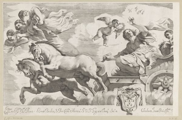This is a photo reproduction of the fresco "Aurora," thought to be made by Guido Reni, at an unknown date. Here, we see Aurora, the Roman goddess of dawn, leading Apollo's chariot, surrounded by the Hours. Painted during the Baroque period, this fresco reflects a time when art was often used to project power and status. What's striking is how Reni captures a sense of dynamic movement. Aurora isn't just passively riding, she is actively ushering in the day. This representation shifts away from more static depictions and presents a goddess taking action. The depiction of women is particularly interesting. The Hours, with their flowing robes and delicate features, embody a certain ideal of femininity. Aurora herself is strong and commanding, yet still presented with a soft, almost gentle beauty. The artwork offers a vision of women intertwined with both power and grace. It reminds us how even in mythological scenes, artists can negotiate the complex roles women play in society and history.