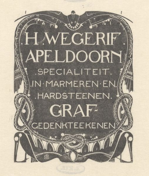 Editor: Here we have a typography print from between 1903 and 1935, "Aankondiging lezingen van A. Besant", most likely created by Mathieu Lauweriks. It has this blocky, almost imposing presence to it, despite its likely small scale. What catches your eye when you look at this, given the visual density of the piece? Curator: It feels like a riddle wrapped in an advertisement, doesn’t it? The weight of the typeface, that dense field of ink… Lauweriks is playing with the visual language of the era, channeling the spirit of Art Nouveau but twisting it. See how the decorative border fights with the blocky text? It’s a controlled chaos, like he’s crammed an entire manifesto into a business card. And the language itself! So declarative. What does it make *you* think of? Editor: It feels…very sure of itself? It reminds me of old-timey posters. So it was basically an ad? What were Bazel and Lauweriks advertising? Curator: Aha! An advertisement for "Hout sneden," or wood carvings - a proclamation about their skills. It suggests the tactile, handmade nature they provided in response to mechanization, offering bespoke announcements and business cards. Look closely. Do you see any elements that signal a connection to the spiritual ideas of someone like Besant, whose lectures were being advertised? Or is this just a sharp, savvy tradesman making a living? Editor: Hmmm…not overtly. The lettering almost has an occult feel to it, but that might be my imagination! Thanks, this gives me a fresh view into commercial design and advertising back then. Curator: Precisely! And isn’t it amazing how much can be communicated, even through a seemingly simple advertisement? I’m seeing woodcuts in a completely new way.