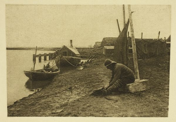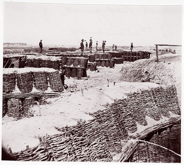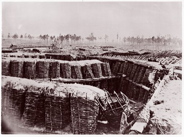 Curator: This is a gelatin-silver print entitled "Fort Price," a haunting image captured by Timothy O'Sullivan between 1861 and 1865. What's your immediate reaction to this stark landscape? Editor: It's bleak. Utterly bleak. There's a tangible sense of weariness, not just in the subject matter, but conveyed in the tones and textures. The crude structures seem to huddle against a vast, empty background. Curator: Precisely. O’Sullivan worked extensively during the American Civil War. His photographs are not just records of events; they shape our understanding of the conflict itself. Consider the image politics involved in depicting the war's impact. Editor: He's documenting not the battlefield glory, but the lived experience of warfare: the relentless drudgery, the makeshift existence. I can only imagine that existence shaped individual identity in complex ways, defining masculinity within a confined and violent context. This isn't a heroic narrative; it's something far more intimate and unsettling. The tents look almost permeable, like barriers to a space that could never be safe. Curator: Exactly. O'Sullivan documented a war often framed by notions of patriotism and valor. Yet, here we see a landscape scarred not only by physical conflict but also by the sheer toll it took on human life. This work invites reflection on how national narratives were constructed—and crucially, whose stories were omitted or downplayed in those narratives. What did it mean for O'Sullivan, as a white photographer, to depict a conflict centered on slavery and freedom? Editor: It's critical to analyze his positionality. He's a witness, yes, but a witness with his own ingrained biases and perspectives, his own visual vocabulary influenced by artistic and cultural currents. We have to unpack the context of 19th-century photography itself. What ideological frameworks determined what was photographable, and how it was presented to the public? These structures dictated access and, therefore, impacted the shaping of history itself. Curator: He forces a dialogue between aesthetics and violence. Editor: Indeed. By stripping away any romanticism and emphasizing the harsh reality, the photo becomes an indictment of war itself. It becomes an interrogation into what humanity, what empathy means in these zones. What are the social implications? Curator: It resonates beyond the historical context. Its lessons are painfully contemporary. Editor: Definitely a photograph that remains vital. It continues to ask questions of us, about power, representation, and the legacy of conflict.
