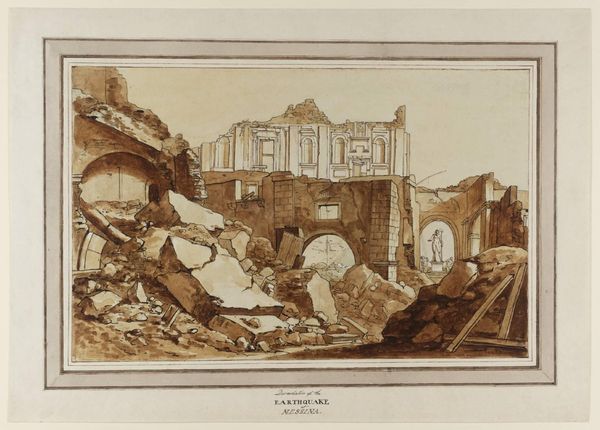 Curator: I am drawn to the scene's overall melancholy. This barren, almost lunar landscape punctuated with ruins has a pensive aura. Editor: Here we have Canaletto's "Landscape with Praying Pilgrim," created sometime between 1707 and 1768. It is a baroque-style etching, a genre he explored alongside his famous cityscapes. Curator: That’s a polite way to describe a place that looks ravaged! The only spots of relative order are the pilgrim and the structure with the cross. Otherwise, it feels almost apocalyptic, wouldn’t you agree? Editor: Canaletto’s landscapes weren't just scenic views; they often intertwined with socio-political commentaries. Ruins frequently symbolize decay, a kind of memento mori—a meditation on mortality. But the praying figure... that is really what speaks. Curator: The composition draws your eye upward to that architecture perched precariously on the hill. What's left of it, anyway. The whole landscape seems like it’s surrendering to time. Editor: It prompts us to reflect on enduring hierarchies. Consider who has the luxury of spiritual contemplation versus those toiling away in the boats or beneath the makeshift shelter on the left. Notice the imbalance in visual weight as a symbolic statement of disparity between those engaging in active labor, versus a posture of meditative supplication? Curator: A bleak point, if true. I do see what you mean; there's a resigned sort of tension, isn't there? All rendered in stark detail. Even the light feels…reluctant. Editor: Indeed. It invites consideration on issues like class, access, labor, and personal reflection. It's a lens through which we can explore inequalities present today. Art of the era always holds so much symbolism that can prompt endless thought and perspective. Curator: In the end, art allows everyone to reach a point where thoughts can be freely formulated! And how intriguing that a picture from so long ago can cause these musings today.
