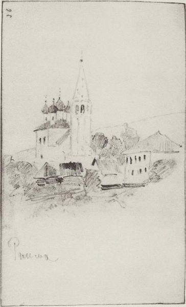 Curator: Welcome. Before us, we have Boris Kustodiev's 1919 graphite drawing, "Autumn." Editor: My initial impression is of transience. The monochromatic palette and delicate linework convey a sense of the season's ephemerality, capturing the subtle melancholy of a landscape in transition. Curator: Indeed. Let's consider the labor meticulously depicted. Notice the construction site on the left, the figures raising what appears to be a log cabin. The visible labor, combined with elements like the horse-drawn cart and grazing livestock, speaks to a localized material process—building, transporting, and sustenance rooted in land. Editor: And those lines – look at the scaffolding – so precarious, such a high contrast to the sturdiness that that cabin aspires to. It brings an element of temporality, of a stage in production, rather than a fixed conclusion. Beyond that construction, we have those almost dreamlike renderings of what appears to be a whole community in the background, each member involved in separate production activities. Curator: Precisely. Now, examine the line work. Kustodiev employs a precise yet subtle technique to build form and texture. The lines, while representational, create an evocative sense of depth. See how the line density and concentration shifts to bring foreground action and detail. It is the density and detail alone that makes certain aspects prominent – very interesting from a semiotic viewpoint. Editor: And the landscape. This isn't merely about celebrating labor; the setting, those trees with their intricate branch patterns almost seem like veins pumping with life – or ceasing to pump. They surround, or rather, embed the cabin itself into nature. Consider the tension there, the built form contrasted against natural organic structure; a commentary, perhaps, on man’s imprint on nature. Curator: I find the juxtaposition subtly handled. It's a testament to Kustodiev's ability to invest realism with a contemplative mood. Editor: Agreed. This glimpse into autumn’s building and coming-togetherness leaves me thinking of art as process more than some pre-destined "object." Curator: Very well observed. This image showcases the talent Kustodiev had in imbuing a detailed observation with introspective significance.