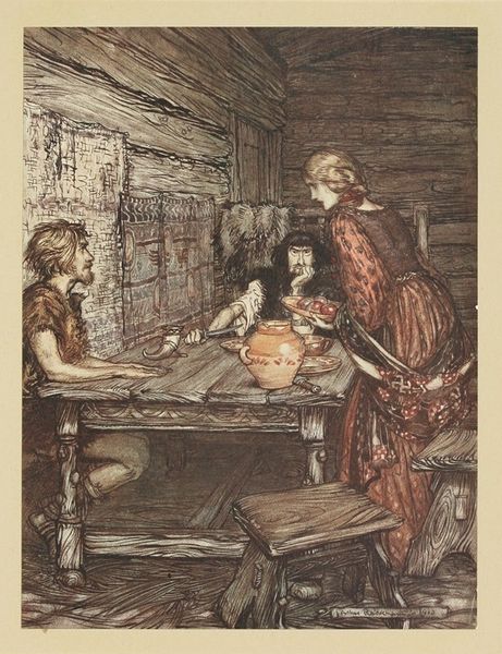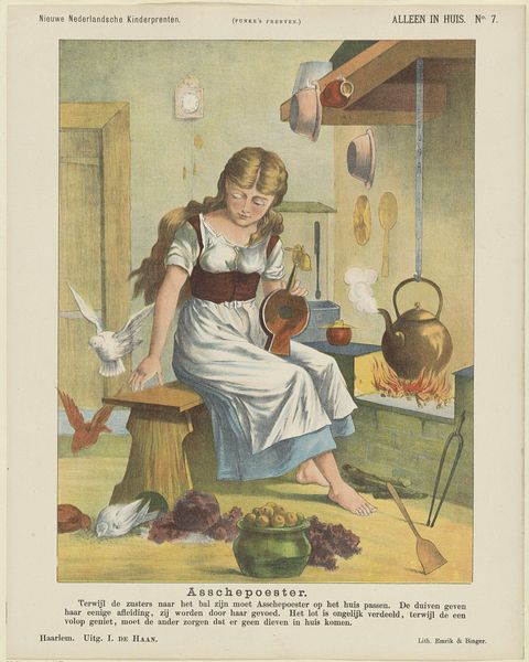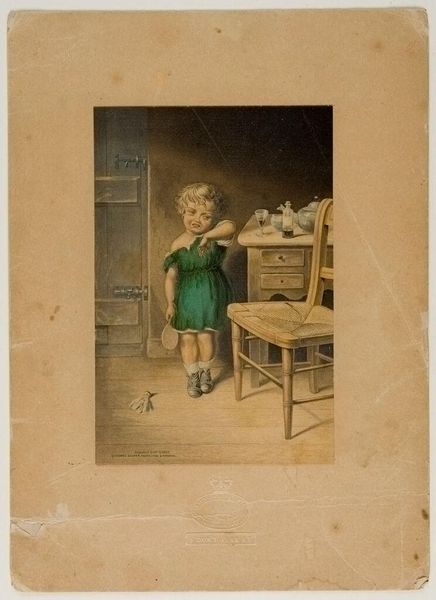 Curator: George Baxter's "So Nice!" presents us with a charming glimpse into a child's world. Editor: The composition is intriguing. The diminutive figure contrasts sharply with the solid, dark background, creating a sense of intimacy. Curator: The girl's enjoyment of her meal evokes associations of innocence and simple pleasures. The steamy bowl suggests nourishment, both physical and emotional. Editor: Notice how Baxter guides our eyes. The chair's ornamental back is aligned with the girl’s head to create a vertical axis, drawing the eye upwards and emphasizing the dark space. Curator: It is also important to consider this image in the context of Baxter's time. Domestic scenes like this became popular as symbols of family values in Victorian society. Editor: Quite, and the earthy colors, predominantly browns and tans, contribute to the feeling of warmth and domesticity. It is all carefully constructed. Curator: Seeing it like this reveals that, beyond the surface charm, it speaks to broader themes of home and childhood. Editor: It's a lovely example of the formal means by which seemingly simple affectations are constructed.