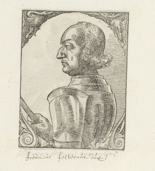 Curator: An air of intensity, wouldn't you say? This print, "Portret van Leonik Tomeu", probably executed sometime between 1549 and 1577, offers a rather direct gaze. Editor: Yes, there's something deeply captivating about his expression. The artist captured a formidable presence through a remarkably intricate line work, it makes me think of knowledge, hard earned, maybe even… guarded. Curator: Let’s delve a little deeper. Notice how the fine lines, typical of the intaglio and engraving techniques of the era, define the subject's features, creating texture and depth. Editor: It's mesmerizing how each stroke gives weight to his beard, those expressive eyes. He’s even holding what seems to be drawing tools or instruments? There’s such precision! You almost forget it's not alive, staring back at you. Curator: Precisely! The figure emerges quite forcefully from the patterned frame that surrounds it. It creates an interesting tension with the linear detailing of the central image. The patterns accentuate the humanist context that typifies the art and philosophical movements of the time. Editor: So, not just a decorative element? I always get lost in the human aspect, the hands, the eyes, I almost forgot the frame around it. The line feels… intentionally rigid, perhaps a nod to the era’s own structures? Or a rebellion against them? Curator: Perhaps both. Remember that Renaissance portraiture was less about exact likeness and more about conveying status, character, moral standing, or philosophical conviction. Editor: Ah, that's right. And with his intent stare, Tomeu definitely makes me wonder what ideas fueled his ambition, that intellectual quest back then... Almost feels like facing one's own intellectual ambitions, now. Curator: An excellent way to see it. The engraving, even centuries later, succeeds in inviting introspection and engaging us in this historical and conceptual journey, all contained within this deceptively small artwork. Editor: Right! Next time I will make sure to look more at the frame! Thanks for shedding a light, It has really changed how I perceive him—a man, and his context.
