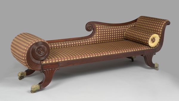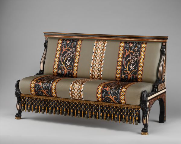 Editor: Here we have Duncan Phyfe’s “Sofa,” crafted between 1805 and 1815. It's currently housed in the Metropolitan Museum of Art, incorporating wood and textile elements. It's such a visually striking piece. What stands out to me is the severe linearity of the upholstery, especially against the curve of the armrests. What do you make of it? Curator: Its Neoclassical style is expressed through precise lines, balanced proportions, and restrained ornamentation, primarily visible along the dark wood frame. What is particularly crucial is the interplay between the solid wood and void created by its shape, most apparently between each leg and the seat. Do you agree? Editor: Yes, I do! Especially that repetition from the frame. The dark wood gives it this almost stoic quality. Is there a purpose behind the upholstery, though? Curator: Consider the tension between its tactile surface and its flat color, its function. We cannot dismiss how the linear pattern directs our eye from left to right, further emphasizing the sofa’s horizontal aspect. Are there specific elements which appeal to you? Editor: I noticed how it contrasts against all of that empty space beneath, thanks to its coloring. The linear design definitely forces you to view it from left to right! Curator: Its color complements the whole of the woodwork to enforce the concept of harmony, in contrast with a world that has a natural chaos. Editor: Right, there’s an elegance and balance. I suppose that's why this work has endured throughout time! Curator: I've never considered Phyfe in the same way as painting, but that balance is precisely what makes the viewing experience a complete visual statement in itself.