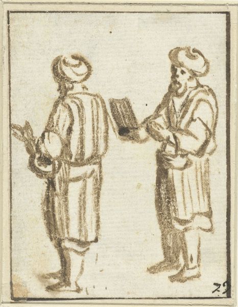 Curator: Looking at this, I immediately sense a study in contrasts, a visual conversation frozen in time. Editor: Indeed. We're observing Christoph Krieger's "Giovanni antichi," an engraving from 1598. What strikes me is the way the printmaking process itself speaks to the social context. The lines, the precision – it all points to a carefully crafted object, designed for circulation and consumption within a specific network. Curator: Absolutely, the linear quality is remarkable. Considering the moment this piece was made, I can't help but ponder the identity of these figures, Giovanni specifically. Who were they? What sociopolitical statements is Krieger trying to make, immortalizing him through this very reproducible medium? Editor: Right. The material production dictates its own constraints. Think of the paper, the ink, the press – each element requiring skilled labor. The resulting prints then become commodities themselves, traveling and disseminating ideas beyond the elite circles who could afford original paintings. Curator: And that dissemination changes everything, right? Suddenly, portraiture and these depictions aren’t just for the upper class. Looking at the line work, there's almost a radical potential—offering a new access point, shifting notions around who gets represented and remembered in visual culture. It invites conversations about who's holding the means of production in 1598 and why? Editor: I agree. Consider too the tradition of printmaking during the Italian Renaissance: apprenticeship, the workshop, the division of labor. Who made the paper? Who ground the inks? All this labor made Krieger’s piece reproducible and therefore gave it potential for greater social impact. Curator: So in the end, we are contemplating more than just “Giovanni antichi.” It’s a complex matrix of personhood, social messaging, and materiality all layered into the history. Editor: Yes, Krieger's print exists as an object, but it's also a point of entry into thinking critically about labor, materials, and networks of exchange that shaped its creation. Curator: Thank you, by bringing to light its physical history, the work then truly shows its face, so to speak. Editor: An approach that really enriches our experience of this intricate image, allowing to see its tangible aspects within a historical frame.