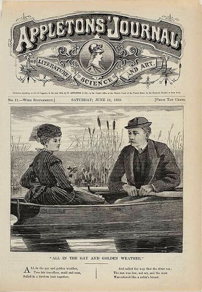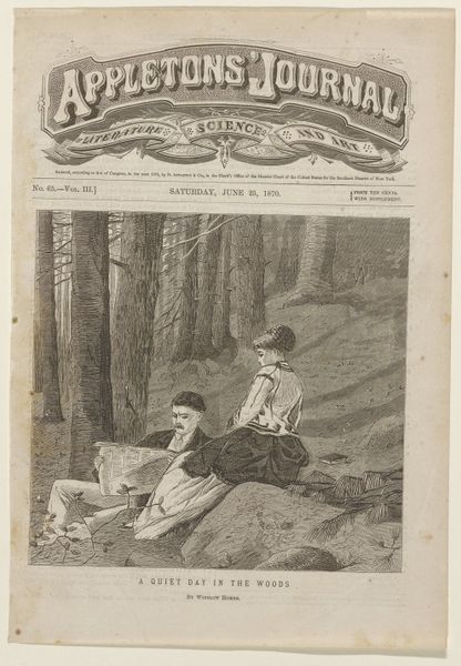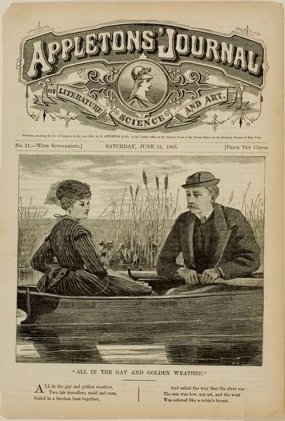 Editor: This is “All in the Gay and Golden Weather,” a wood engraving print by Winslow Homer, dating back to 1869. I’m really struck by the contrast of textures, the dense lines forming these intricate patterns on their clothes, especially against the softer, blurred background. What do you see when you look at this print? Curator: It makes me think about summer afternoons drifting on the river...or trying to, anyway. Homer’s got this fantastic way of capturing seemingly simple moments and imbuing them with something deeper. Here, a young couple’s serene boat ride belies the social currents and aspirations bubbling beneath the surface. Look at the way they’re positioned – separate, almost mirroring each other rather than engaging directly. Notice how the reeds behind them seem to subtly isolate them, cocooning them within this moment. Editor: That's interesting. I hadn’t considered the sort of...tension there. I was so focused on the details and almost romantic idea of it all. Curator: Exactly. On one level, we have this idyllic genre scene plucked from daily life. Yet, through the use of black and white engraving – a medium in itself hinting at reproducibility and the reach of imagery in that era – and through subtle composition, he transforms it. Do you think the title itself contributes to that reading? "All in the Gay and Golden Weather"...It's almost too perfect, too staged. Editor: I suppose the weather *could* be masking all sorts of social expectations for marriage and societal status. So this isn’t just a scene. It's an observation! Curator: It is that friction, I think, between the apparent subject and the underlying social commentary which provides the real zest to this image. Editor: Thanks, it makes me appreciate the picture a lot more now!