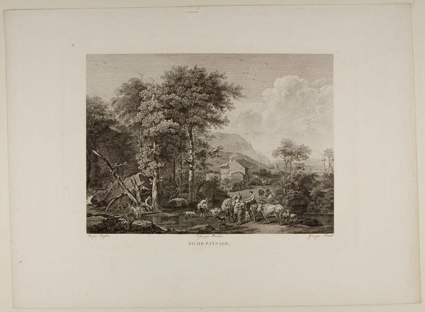 Curator: This is "The Goddess of Discord" by Thomas Abel Prior, a rather ominous landscape. Editor: Ominous is right, a rather brooding composition of light and shadow! Note how the artist uses stark contrasts to create visual tension, almost like a stage set. Curator: Indeed, the goddess figure herself stands apart but seems connected, observing the groups of people, perhaps reflecting on societal unrest. This image comes to us without a date, but its themes resonate across centuries – the ever-present potential for discord. Editor: The balance is interesting too. The figures are carefully arranged to guide the eye through the landscape, a strategic distribution of forms within the pictorial space. Curator: I agree. It’s impossible to ignore the social commentary here, especially considering how power structures often sow discord to maintain control. It makes one wonder about the roles of these figures in such a system. Editor: Yes, the piece provokes a deeper consideration of what order and beauty can be found through this chaos. Curator: A potent reminder that discord, while destructive, can also be a catalyst for change.