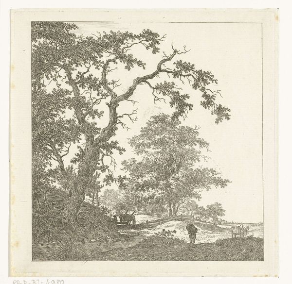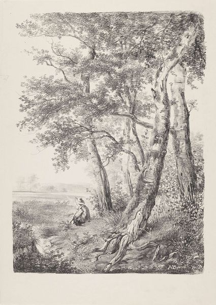 Editor: So, here we have "Landscape with Ruin and Seated Figure" by Pieter Bartholomeusz. Barbiers, sometime between 1809 and 1837. It's a drawing and etching currently residing in the Rijksmuseum. There's something so still about it. Almost mournful. A person sits beneath a massive tree looking out towards some ruins. What strikes you most when you look at it? Curator: It whispers of Romanticism, doesn’t it? All that lovely, uncontrolled nature juxtaposed with the solemn remnants of humanity's hubris. It makes me wonder what the seated figure is contemplating. Is he remembering grand stories or feeling melancholy as he sees his own insignificance mirrored in the crumbling stones? I feel as though I could insert myself there. Do you get a similar sense of intimacy? Editor: Absolutely! It feels very human-scaled, despite the imposing trees. Like a quiet invitation to sit and reflect. Do you think the artist intended that sort of connection? Curator: Oh, I think Barbiers tapped into something deeply resonant. Romanticism always yearns, and I feel that longing acutely here. The way the etching captures the light filtering through the leaves is pure poetry. And think about the medium – the deliberate act of etching, a kind of controlled decay mirroring the ruin itself. What an intriguing choice! Does it change how you read the figure by the ruin? Editor: I hadn't thought of the etching process as related to the ruin, that's really interesting. Now the figure does feel less passive, maybe they are more engaged with the process of change. Thank you! Curator: My pleasure! These little echoes are everywhere once you start listening, aren't they? Art has always got a dialogue running with decay and life and love, if you look and let your heart go for a stroll there!