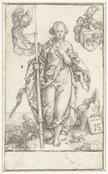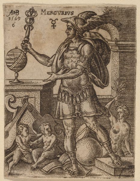 Curator: Immediately, I see so much crosshatching! The artist was really committed to capturing detail with lines. Editor: Indeed! Here we have Abraham de Bruyn’s engraving, "Venus," created in 1569. It's a striking example of Mannerist printmaking. Curator: It has a peculiar stillness to it. The flames leaping from the heart feel performative. Does it speak of love's passion or its artifice? I wonder about that little cupid, he looks mischievous. Editor: As a print, its production relies heavily on craft. The copperplate would have been meticulously worked, each line a deliberate act of labor to replicate the artist’s design, turning into something reproducible. It speaks volumes about disseminating ideas about love. Curator: A profitable idea, indeed! Consider the market; this piece probably spoke volumes about courting in that time! Is she obtainable? Out of my league? Even that bull at her side suggests...power? Control? It makes one ponder, doesn't it? I’m quite drawn to the way she is glancing away from the viewer, creating a strange tension. Editor: And observe Venus’ attire. Rather than being totally nude, she's partially draped. This element also speaks of that moment's modesty. Moreover, engravings like this helped build markets for artists by expanding consumer access. Curator: Thinking about this work, I now envision De Bruyn bent over that copperplate, line after line, driven by a love perhaps for his craft! Editor: Or just driven by profit! It's fascinating to consider this "Venus" not as an ethereal vision, but as the outcome of physical labor and mercantile ingenuity. Curator: Quite. This was definitely more profound than my initial reaction! It also shows the dissemination of classics, made easily and efficiently, that can reach an untapped demographic. Editor: Likewise! This engraving provides a peek into the social history of art's creation and consumption.