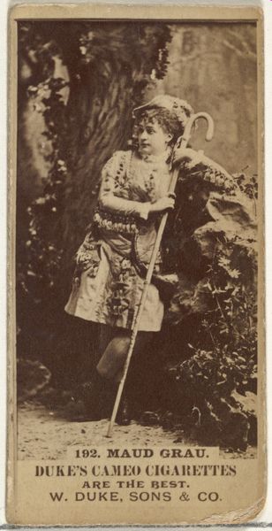 Editor: Here we have an interesting piece! It's a photograph from 1887 by Allen & Ginter, from the "Actresses and Celebrities" series, featuring Sadie Martinot. It was actually used as a promotional item for "Little Beauties Cigarettes," part of Allen & Ginter's tobacco products. Something about this sepia-toned portrait, maybe her outfit, feels almost like a stage costume... a sort of playful anachronism. What's your take? Curator: Playful is a great word! It *is* theatrical, isn't it? Knowing it's from a cigarette card series kind of turns my perspective on its head. Back then, these images were like tiny portals into the glamorous lives of actresses. The very slight blur of the photograph adds to a sense of faded glamour – it makes me think about how fleeting fame can be, almost like the smoke from one of those "Little Beauties" dissolving into air. Doesn't it feel a bit melancholic, too? Even with the suggestion of leisure with the fishing rod... Editor: Melancholic, yes! Like she's posing in a costume but still caught in a moment of reflection. Curator: Exactly! Perhaps even burdened by that momentary fame… Almost a "caught between two worlds" kind of feel. This image is a lovely collision of art, advertising, celebrity, and that inescapable shadow of mortality. It's funny, isn't it, how something designed to sell cigarettes can evoke so much? Editor: Definitely makes you think about how we assign meaning to things. Thanks, that’s a completely different angle than what I initially considered. Curator: And that's the best part, isn't it? An image can contain a universe of stories, all just waiting for us to find them.