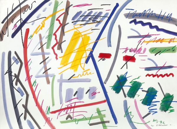 Curator: Julie Mehretu's "Stadia III" from 2004—an arresting mixed-media piece combining acrylic paint and other elements. It immediately overwhelms me, almost like a chaotic urban sprawl rendered with tremendous energy. Editor: Yes, it is overwhelming at first glance. There’s so much happening on the canvas, a whirlwind of geometric shapes and chaotic lines. I wonder, what does Mehretu seek to capture or represent in this dynamic, layered composition? The layers almost suggest a palimpsest, hinting at previous forms or ideas obscured beneath the surface. Curator: Exactly! She often explores the idea of mapping—architecture, cities, societies, movements—but it is all deconstructed. Considering the materials, she has a complex, multi-layered technique incorporating drawing, technical drafting, and printmaking processes. This allows her to investigate complex interactions. The interplay of those different processes yields unique visual experiences and intricate social commentaries. Editor: The 'Stadia' title makes me consider spectacles, perhaps the spectacle of political rallies or global sporting events. What sociopolitical undertones resonate through these forms? Do you think it also references historical avant-garde movements known for their radical politics of imagery? Curator: I certainly think so. Knowing Mehretu, the political and social commentary is deliberate. Her background is deeply intertwined with her art, shaping how she perceives and translates socio-political structures onto the canvas. We're seeing a kind of abstraction that addresses pressing contemporary issues. The question becomes, how do her means reflect the message? What about the production –the act of layering— speaks to the process of building up complex structures only to see them destabilized or dismantled? Editor: That resonates. Her production parallels a cycle of construction and deconstruction in social realms. It shows power struggles reflected within the composition, a visual discourse concerning authority and perhaps the collective. The materials –acrylic paint married with technical drafting – create not only depth but also imbue the work with a visual language appropriate for modern sociopolitical landscapes. Curator: Agreed, that resonates quite well. I find myself now deeply contemplating how historical contexts intertwine within her choices. Editor: A profound meditation. Let's now reflect on how galleries and museums provide spaces where audiences can further contemplate the impact of “Stadia III’s” grand complexity and layers, reflecting society's foundations through the very art presented.