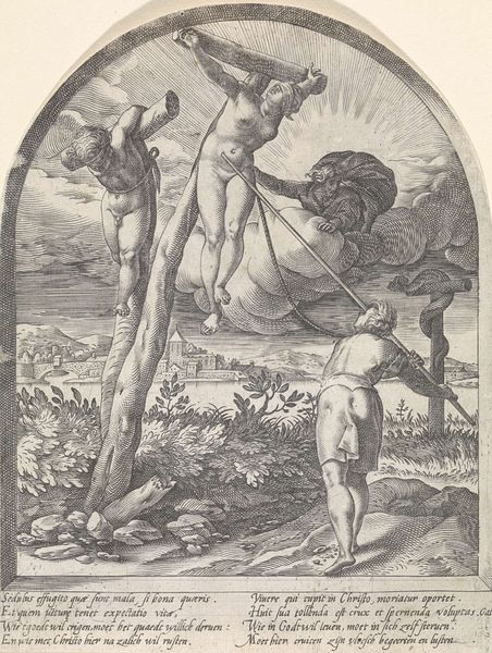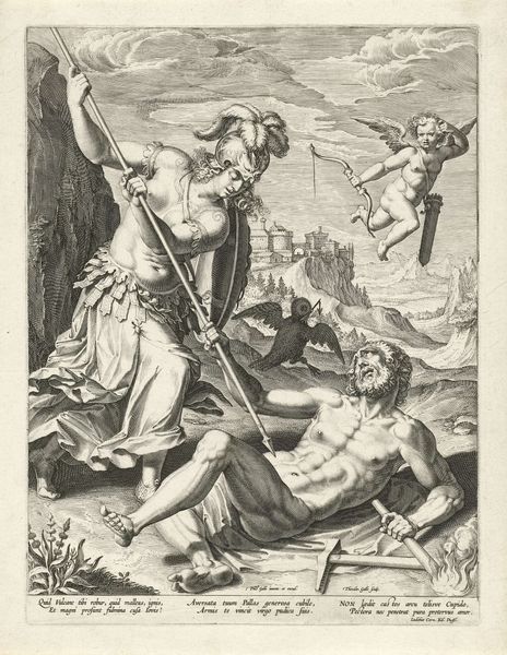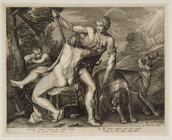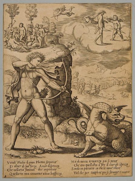 Curator: This print, titled "Apollo Pursuing Daphne," is by an anonymous artist. Look at the frantic energy! Editor: It's all in the chase, isn't it? The way the lines create the illusion of movement, the implied narrative of desire and escape – the materiality of the printed line becomes a vehicle for the story itself. Curator: Exactly. Prints like these circulated widely, shaping popular understanding of classical myths. Think about the social context: prints democratized art, moving images beyond the elite. Editor: Absolutely. This very act of production—the plate, the press, the ink—facilitated that transformation. The labor involved, the accessibility of the image… it's a whole different consumption model than a unique painting. Curator: And considering the context of the print, it's not just about the myth, but also about societal power structures and the male gaze. Editor: So, in its dissemination and consumption, a seemingly straightforward mythological scene becomes a vehicle for exploring societal values and power dynamics. Curator: Precisely. An intriguing lens through which to view art's broader social impact.