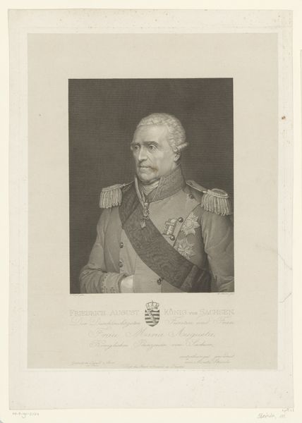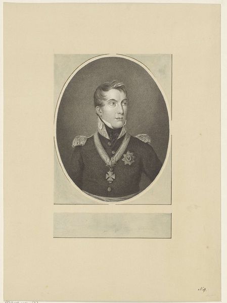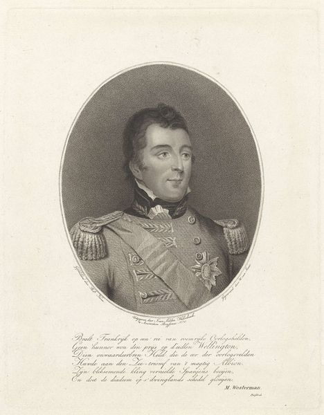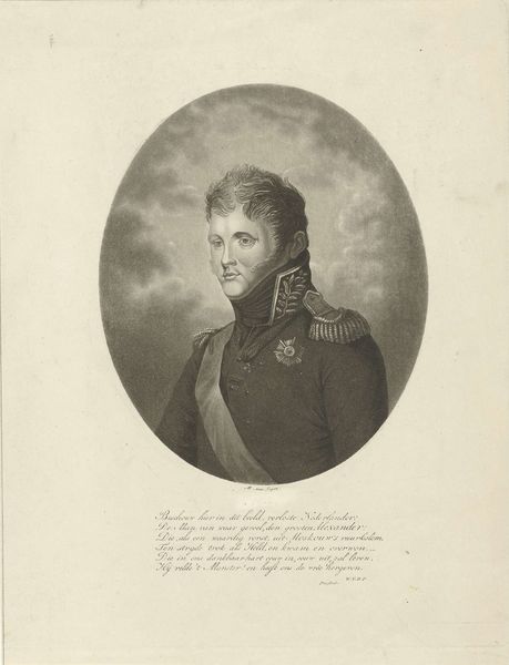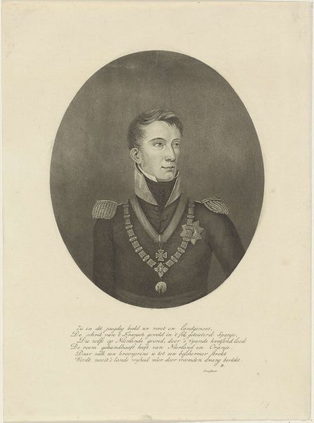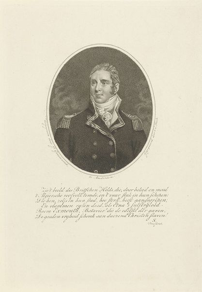 Curator: Here we have "Portret van Theodorus Frederik van Capellen," dating from around 1806 to 1819. It's a print, specifically an engraving, currently held at the Rijksmuseum. Editor: Oh, he's got a look, doesn't he? Like he’s just seen the punchline to a cosmic joke. The severity of his attire contrasts humorously with his kind, twinkling eyes. Curator: Indeed! The subject was a prominent naval figure. Notice the details of his uniform – the decorations, the cut of the coat. These are potent symbols of power and status in the neoclassical style, connecting him to an image of civic virtue. Editor: I like that idea – civic virtue! It reminds me of those old Roman busts, all stoic faces and implied heroism. Only this is… softer somehow. The engraving gives it a real delicate quality. And an interesting poem, a dedication, it is included in the same sheet. Curator: It really does underscore the essence of his era, and this engraving technique—so meticulous! It captures not only his likeness, but a carefully constructed image. Those stipples and lines build up more than just form; they’re practically weaving the threads of his reputation. Notice how he’s framed in the oval. Editor: It is, as though history itself is giving him a hug! Seriously, the choice of this technique— it’s genius. There's a strange vulnerability about this, capturing so delicately someone known for heroic deeds on the high seas. And a strange written praising his deeds just beneath, which adds another symbolic layer! Curator: Absolutely. That juxtaposition invites contemplation. Consider the weight of responsibility he bore versus this light touch of the engraver’s hand. Perhaps it's a commentary on how history remembers its heroes – both grand and intimate. Editor: Well, I know I'm certainly going to think of Van Capellen next time I feel the need for a quiet, slightly bemused, act of quiet bravery. There's something strangely reassuring about this particular rendering of the heroic ideal. Curator: I agree. It's in those small paradoxes, I believe, that history truly comes alive. The way the art captures these qualities so beautifully gives the hero an individual and approachable personality.